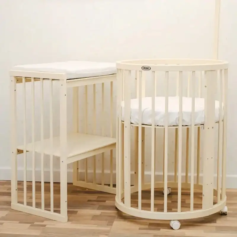 Популярная трансформация кроватки сразу в 2 предмета: круглая колыбелька + пеленальный столик!