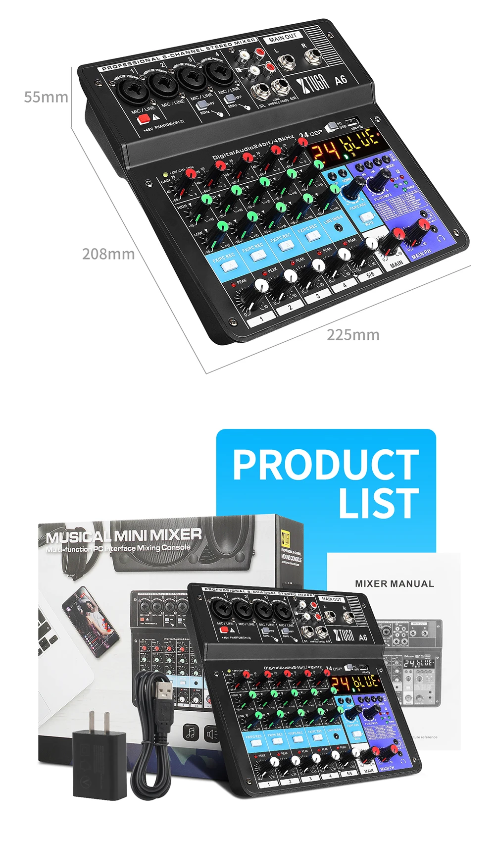 1. Компактный и легкий аудио Миксер с цифровым звуковая карта-A6 является многофункциональным 6-канальный Миксер с звуковая карта, которая может быть удовлетворить пользователям Домашнего производства музыки, сетевого вещания, в прямом эфире, K песня и другие потребности.