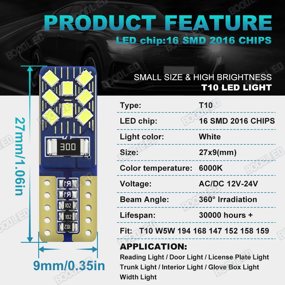 👍Преимущества этого товара: нет полярности и истинного Plug-N-Play. ❤Широкое применение: 168 светодиодный светильник может использоваться для номерного знака светильник/межкомнатный дверной светильник/парковочный светильник/боковой маркер светильник/багажник Грузовой светильник/купольный светильник/светильник вежливости/светильник карты/бардачок светильник. Применение варьируется в зависимости от отделки транспортного средства, оно может подойти к одному или 2 другим позициям. ❤Подходящий Размер: Auxbeam 2825 светодиодный лампы совместимы с 194 / 168 / W5W / 2825 / 2827 / 12961 / 147 /152 / 158 / 159 /161 / 175 / 184 / 192 /259 / 280 / 285 / 447 / 464 / 501 / 555 / 558 / 585 / 655 / 657 / 1250 / 1251 / 1252 / 2450 / 2652. Спецификация: 1. Модель: T10 194 921 2. Светодиодный Тип: SMD 2016 3. Количество светодиодов: 16 шт. 4. Рабочее напряжение: AC/DC12 V 5. Световой поток: 400 лм/лампа 6. Установка: подключи и работай. 7. Размер: 27x9 мм 8. Цветовая температура: 6000-6500K 9. Управление срок службы:> 50000 часов 10. Посылка: 10 упаковок