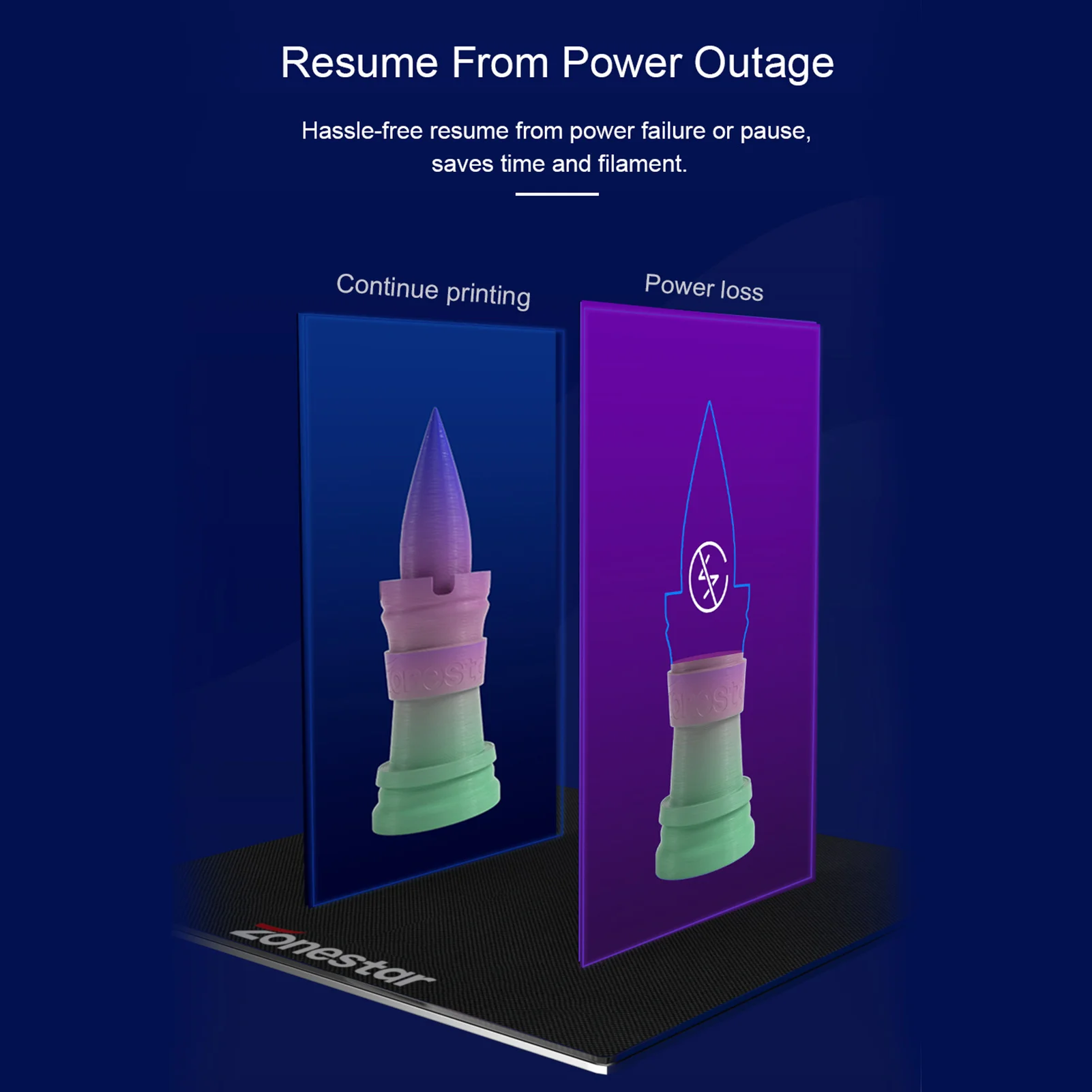 【 Функция прерывания работы 】Его умный датчик может автоматически восстанавливать печать j ob точно в том же месте, где он был остановлен после отключения питания или поломки нити. Эта функция полностью избавляет от хлопот повторяющейся и трудоемкой печати j obs, вызванных неожиданным отключением питания.