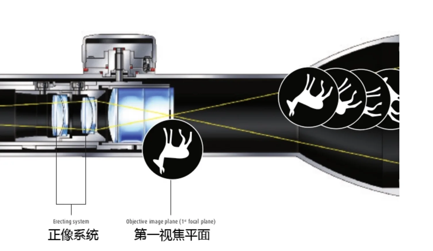 В большинстве областей имеется сетка, установленная на вторая фокальная плоскость (возле окуляра). В то время как, в настоящее время это всегда была практика, чтобы соответствовать сетке в первой Фокальной плоскости (сетка увеличивает свой размер при изменении увеличения от низкого до высокого). Каждая система имеет свои преимущества.