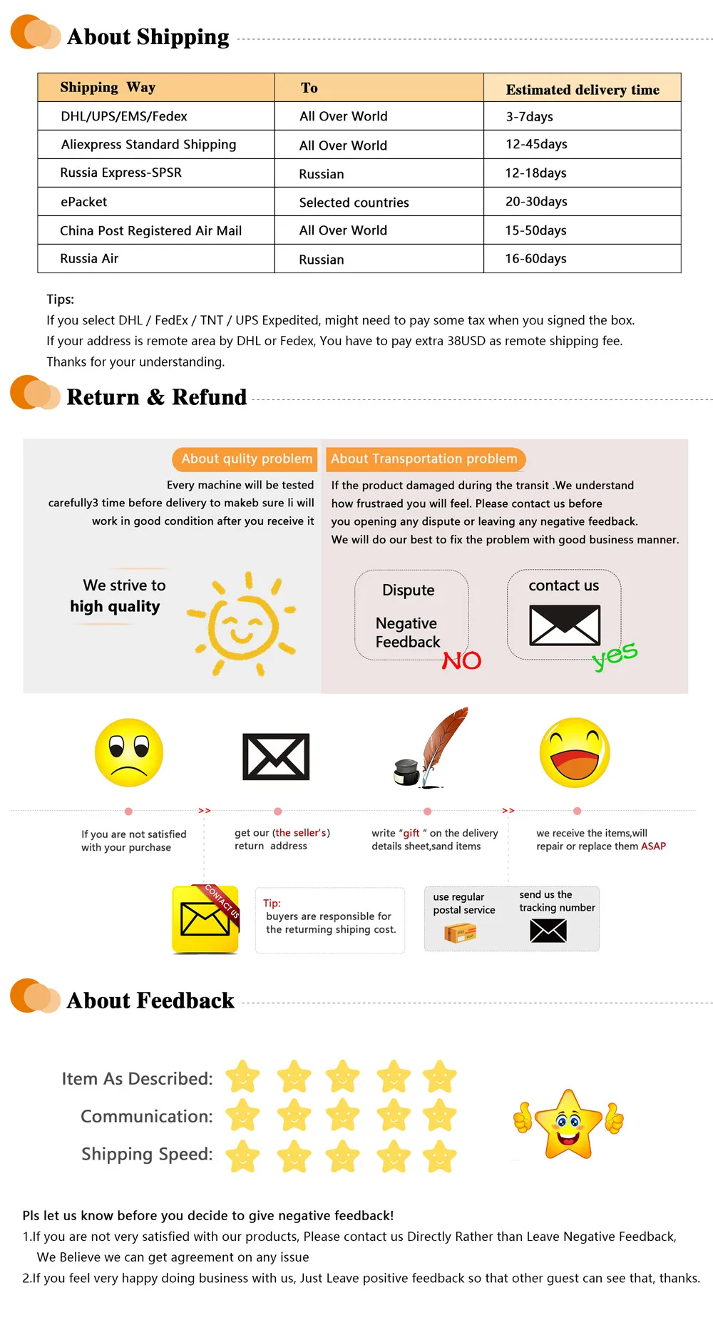 Если вы выбираете DHL / FedEx / TNT / UPS ускоренный, вы получите товары в течение 7-15 дней, но, возможно, придется заплатить налог, когда вы подписываете посылки.