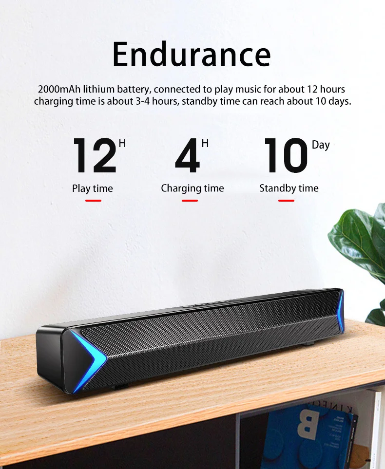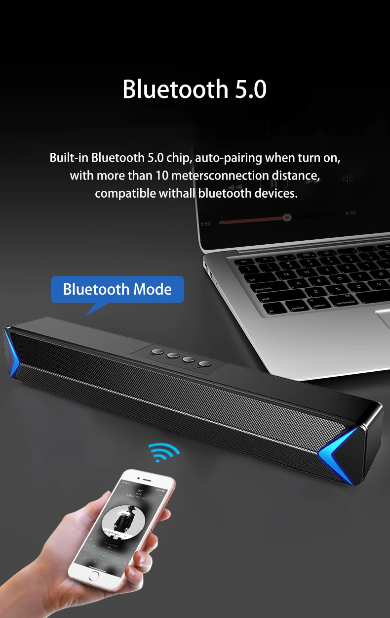 2020 Bluetooth USB проводной мощный компьютерный динамик ТВ звуковая панель стерео сабвуфер басовый динамик объемная коробка для ПК ноутбука планшета12,8-дюймовый ТВ звуковая панель с реверсивным звуковымСо встроенным сабвуфером обеспечивает мощные басы, улучшает домашние аудиосистемы, отлично подходит для небольших сред, подходит для телевизоров Bluetooth, включая Samsung, Vizio, TCL, LG, Sharp, Philips, Sony, xiaomi и еще много телевизоров и телефонов.2,1 канальный СаундбарС полнодиапазонными динамиками 2x3 Вт, объемным звуком на выходе для всех ваших фильмов, музыки и ТВ-шоу, наслаждайтесь наполнением 97 дБ комнаты, кристально чистым звуком с общим гармоническим искажением менее 1%5 режимов воспроизведенияРазработан с технологией DSP, поддерживает 5 режимов воспроизведения, включая Bluetooth, usb-диск, Micro SD карту, AUX Line in и fm-радио.Проводной и беспроводнойПоддержка беспроводного Bluetooth 5,0, поставка оптического кабеля и AUX кабеля для проводного подключенияЗвонки без рукИнтеллектуальный микрофон с шумоподавлением, отвечайте на звонки, не доходя до вашего телефона.Крутой светодиодный светильникКрутой светодиодный светильник, отжимается при включении, и его можно выключить при необходимости.Большой аккумулятор 2000 мАчУмный динамик с перезаряжаемой батареей 2000 мА · ч, одна полная зарядка позволяет воспроизводить музыку до 12 прямых часов при 50% громкости (время воспроизведения зависит от уровня громкости и аудиосодержимого)Hi-fi стереоИграете ли вы в игры, слушайте музыку или наслаждаетесь подкастами, вы почувствуете более качественный звук.TWS FuntionДля удовлетворения потребностей любителей музыки этот bluetooth-динамик разработан специально с функцией TWS. Когда два динамика соединены по технологии TWS, мощность динамиков может достигать 10 Вт, они образуют аудиосистему, которая окружает и позволяет различным каналам менять пространство, приносит богатое чувство слуха и расширения.Функции