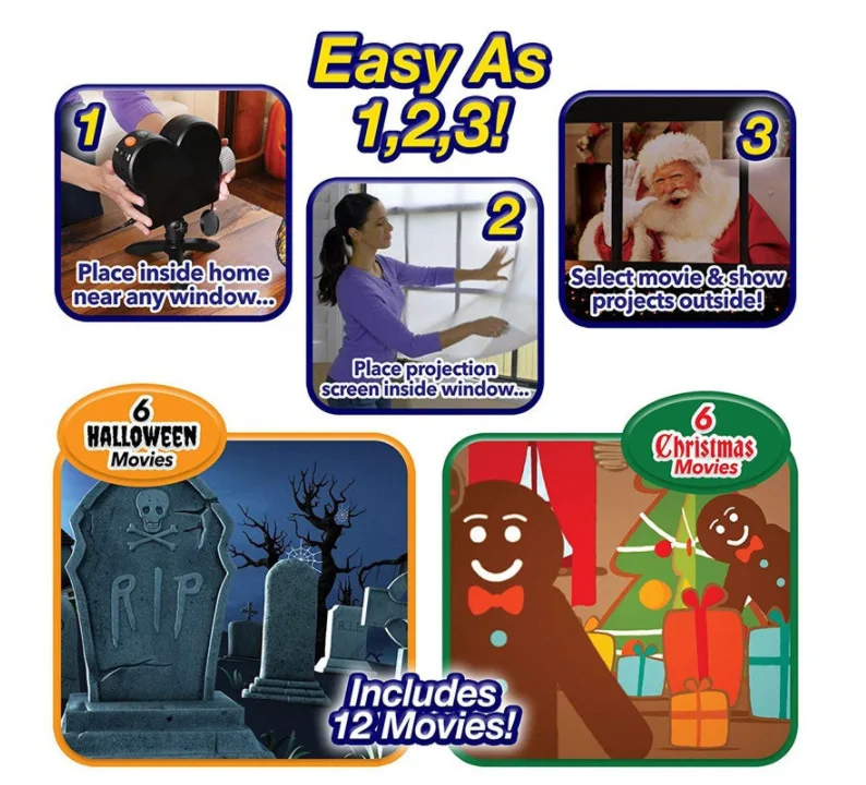 12 фильмов создают свою собственную виртуальную зимнюю страну чудес, играя в Рождественский фильм или потрясающий жуткий дом, играя в фильм на Хэллоуин-имеет 12 встроенных фильмов: 6 рождественских и 6 Хеллоуин.