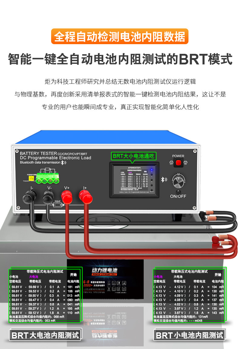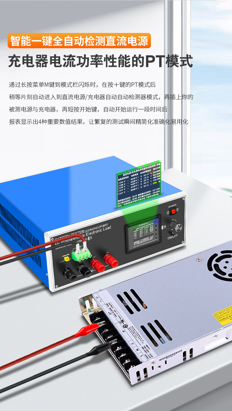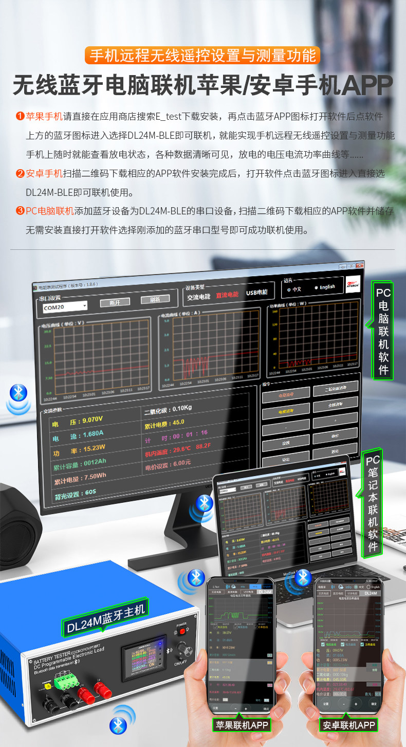 Эта нагрузка может быть использована на автономном компьютере, или может управляться компьютером, подключенным к компьютеру через Bluetooth. Через главный компьютер вы можете нарисовать кривые разряда, передавать данные, сохранять данные и т. д. для различных разрядов постоянного тока, таких как: свинцово-кислотные батареи, литий-железо-фосфат, цинковые серебряные батареи, солнечные панели, полимерные батареи, тройные батареи, аккумуляторы и другие типы батарей могут быть протестированы для разрядки, А также обнаружение источников питания постоянного тока, зарядных устройств, источников питания и кабелей передачи данных.