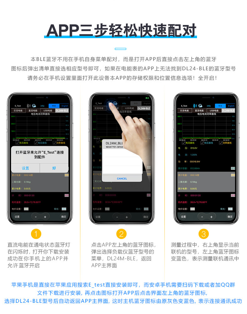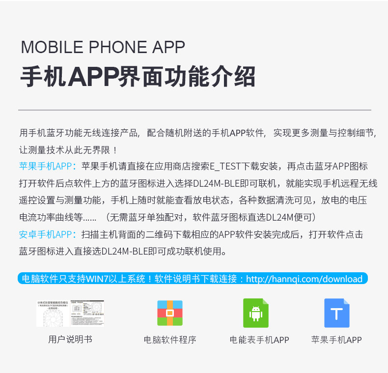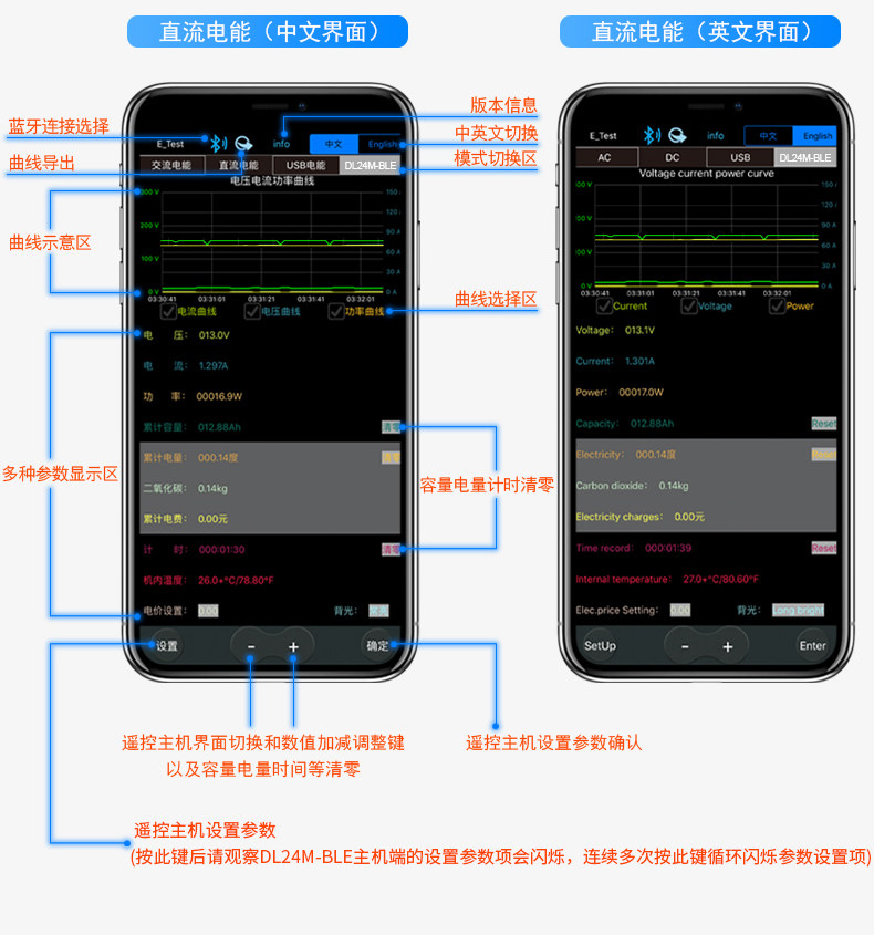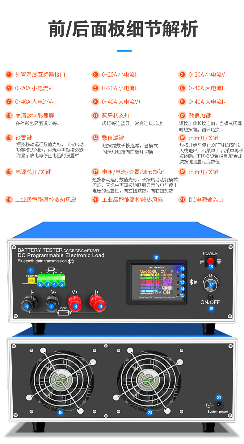 Эта нагрузка может быть использована на автономном компьютере, или может управляться компьютером, подключенным к компьютеру через Bluetooth. Через главный компьютер вы можете нарисовать кривые разряда, передавать данные, сохранять данные и т. д. для различных разрядов постоянного тока, таких как: свинцово-кислотные батареи, литий-железо-фосфат, цинковые серебряные батареи, солнечные панели, полимерные батареи, тройные батареи, аккумуляторы и другие типы батарей могут быть протестированы для разрядки, А также обнаружение источников питания постоянного тока, зарядных устройств, источников питания и кабелей передачи данных.