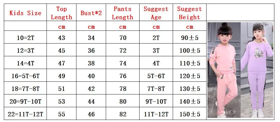 Size Table120=3T-4T,Top Lenght:47cm,bust:38*2cm,pants length:74cm,Suggest Height:110±5cm 130=5T-6T,Top Lenght:50cm,bust:40*2cm,pants length:76cm,Suggest Height:120±5cm 140=7T-8T,Top Lenght:53cm,bust:42*2cm,pants length:78cm,Suggest Height:130±5cm 150=9T-10T,Top Lenght:56cm,bust:44*2cm,pants length:80cm,Suggest Height:140±5cm 160=11T-12T,Top Lenght:59cm,bust:46*2cm,pants length:82cm,Suggest Height:150±5cm