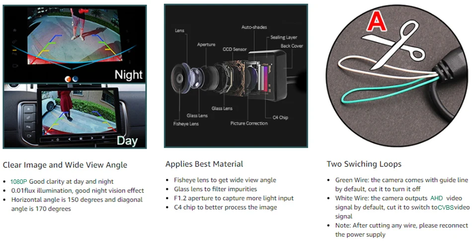 * Поддержка AHD и CVBS видеосигнала --- эта Автомобильная камера заднего вида может работать как с AHD мониторами, так и с AHD мониторами. Выходной видеосигнал CVBS по умолчанию, если вам нужно его подключить к монитору CVBS, пожалуйста, отрежьте белый кабель на камере и повторно подключите к источнику питания.