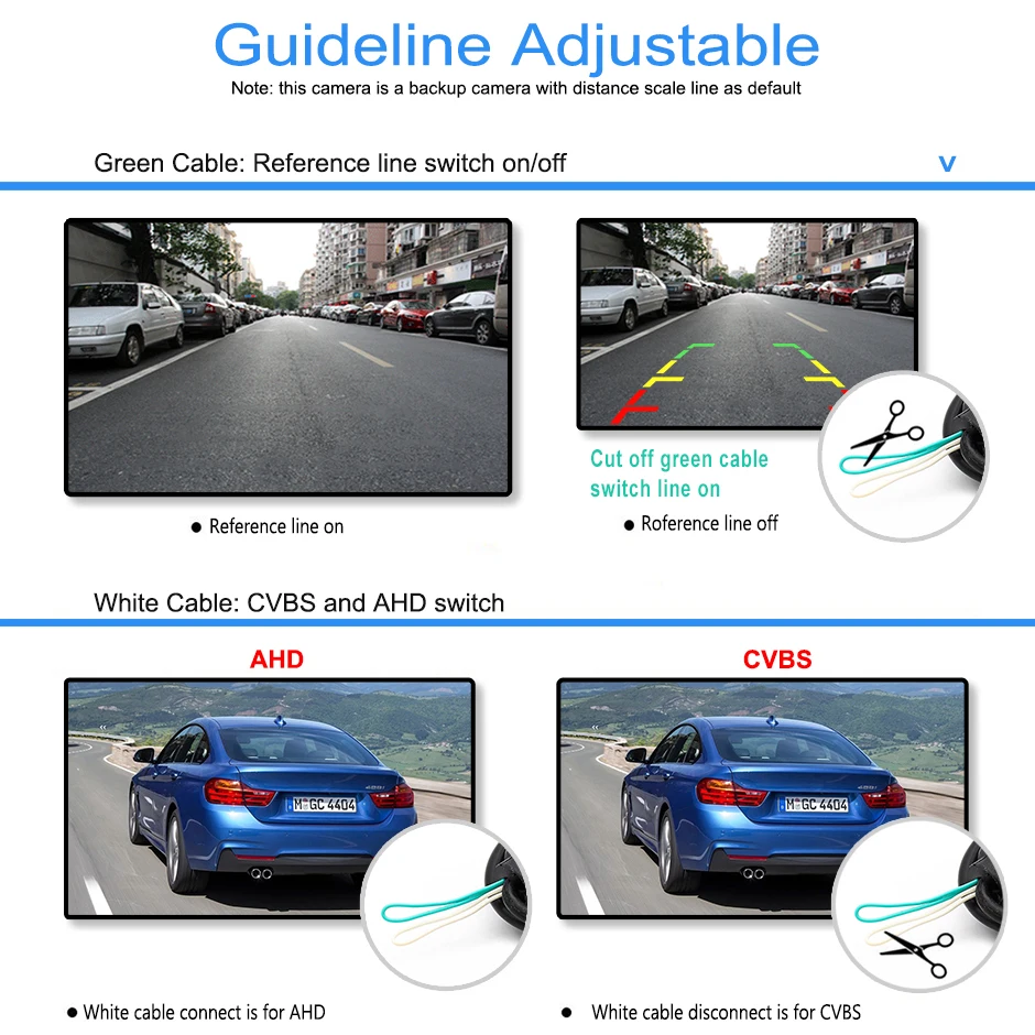 * GUIDE LINE ON OR OFF ADJUSTABLE---There is a small green switching loop on this reverse camera. When you get it, it is with guide line by default. If you don’t need the guide line, please cut the green loop and reconnect to power supply.