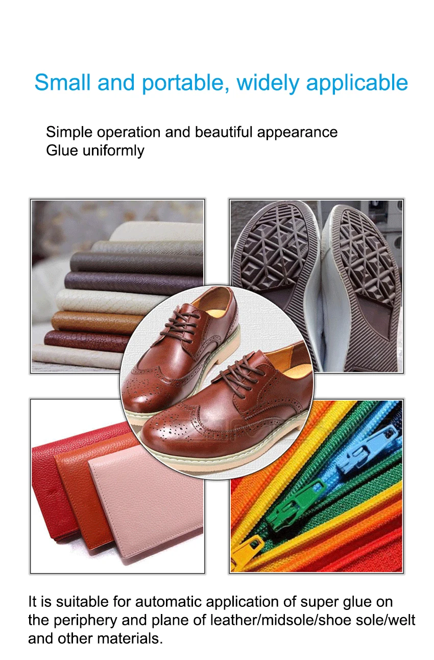 Подходит для автоматического нанесения супер клея на периферию и плоскость кожи/промежуточной подошвы/подошвы обуви/ранта и других материалов.