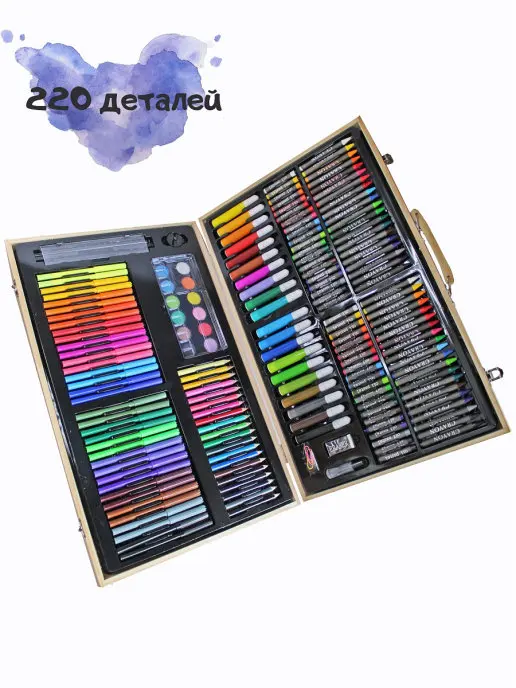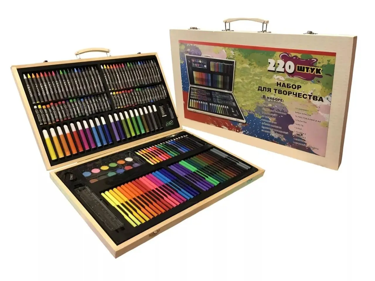 Набор для творчества художественный на 220 предметов в самом элегантном и практичном деревянном чемоданчике, подходящем и мальчикам и девочкам! Наполнение 40 восковых пастелей, 40 масляных пастелей, 36 фломастеров, 20 мини маркера, 20 цветных карандаша, 12 цветов акварельных красок, 10 листов бумаги А4, 35 разноцветных скрепок, 1 простой карандаш, 1 ластик-стерка, 1 точилка, 1 палитра, 1 клей, 1 кисть, 1 линейка, 1 органайзер. Углы аккуратно обработаны, фурнитура качественная, есть удобная ручка и 2 надежные защёлки! Комплектация 40 восковых пастелей 40 масляных пастелей 36 фломастеров 20 мини маркера 20 цветных карандаша 12 цветов акварельных красок 10 листов бумаги А4 35 разноцветных скрепок 1 простой карандаш 1 ластик-стерка 1 точилка 1 палитра 1 клей 1 кисть 1 линейка 1 органайзер.