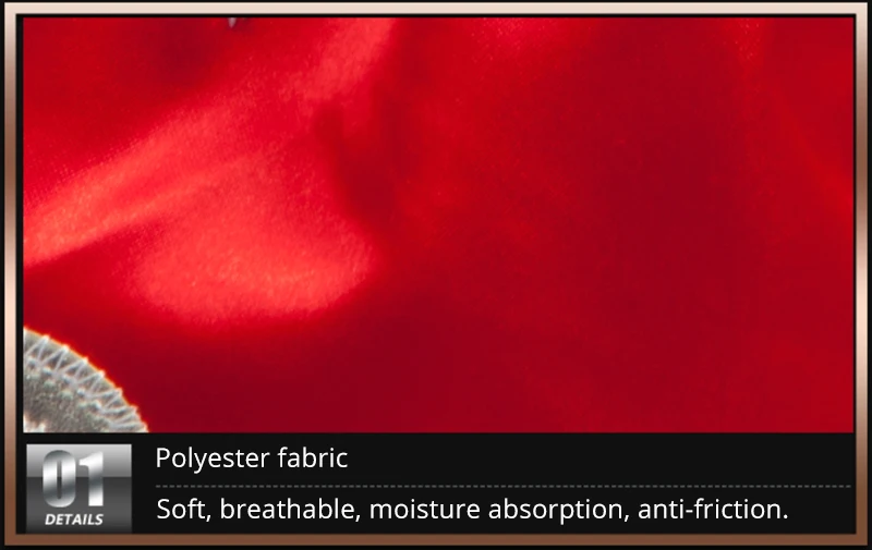 1. Высококачественная полиэфирная ткань, мягкая на ощупь, дышащая, влагопоглощающая, Антифрикционная.