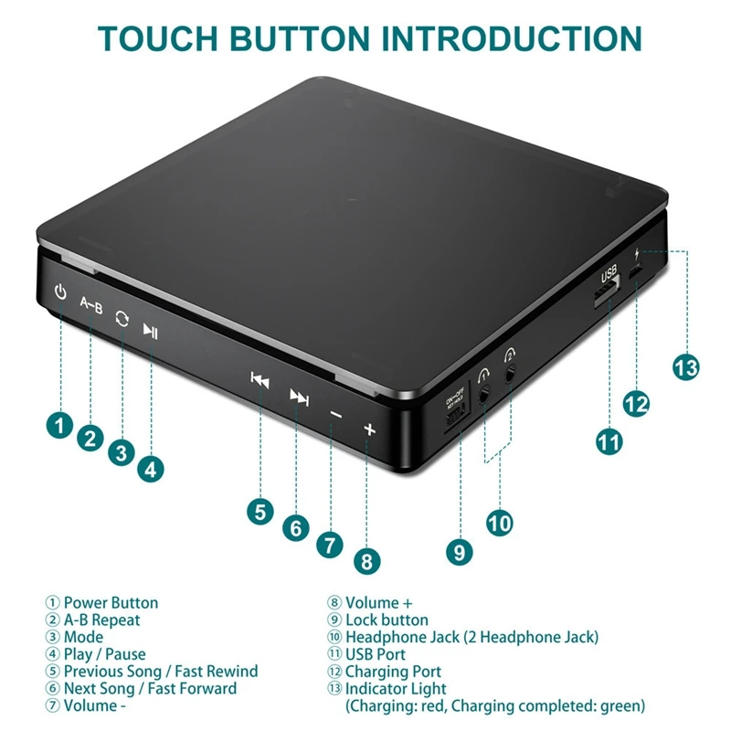 [Перезаряжаемая батарея 1200 мАч] Портативный персональный CD-плеер поставляется с литиевой батареей 1200mh. Не нужно использовать батарейки AA или Всегда подключать зарядное устройство к cd-плееру. Вы можете использовать прилагаемый usb-кабель для зарядки, полная зарядка около 4 часов. Портативный и удобный для вас, чтобы носить его в любом месте, где вы хотите наслаждаться музыкой [Многофункциональный] cd-проигрыватель имеет различные современные особенности. DIR: все файлы можно воспроизводить повторно для mp3; 4 режима воспроизведения: Повторите трек, повторите все, DIR, INTRO, SHUF [Более Совместимость] широко совместим с компакт-дисков, MP3 компакт-дисков, CD-R, HDCD форматы/AUX кабель/USB кабель/связан со всеми звуковой устройств 3,5 мм аудио вход, как, например, подключения акустического или гарнитуры или автомобиля, этот CD-плеер дает вам больше выбора, чтобы наслаждаться любимой музыкой. Примечание: Пожалуйста, проверьте, вращается ли ваш диск или нет. Если ваш формат диска не совместим, он не будет работать [Идеальный выбор в подарок] маленький и удобный музыкальный CD-плеер с классическим черным цветом, гладкий внешний вид с идеальным ЖК-дисплеем. Это лучший выбор для любителей музыки, студентов и будущих мам, и самый теплый подарок для друзей, семьи и детей Блокировка ключа: после настройки режима воспроизведения и звуковых эффектов, вы можете переключить выключатель питания в положение удержания, чтобы предотвратить окружающую среду, например, непослушные дети или многолюдные случаи от влияния на настройки игрока.