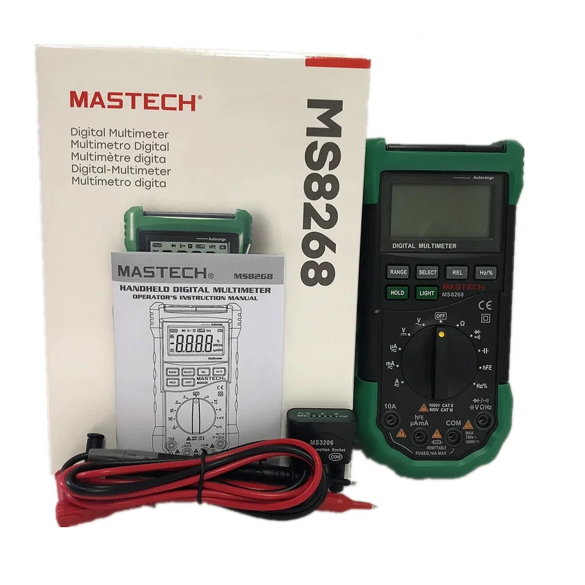 Этот профессиональныйАвтоматический цифровой мультиметр (MS8268)Изготовлено компанией MASTECH, которая является одним из крупнейших и наиболее известных производителей высококачественных электронных измерительных приборов. Он имеет множество функций для измерения и тестирования различных параметров, включая напряжение постоянного и переменного тока, постоянный и переменный ток, сопротивление, емкость, частоту, рабочий Круг, транзистор, Диод и тест на непрерывность.Этот мультиметр является высокопроизводительным и точным инструментом сБольшой 3 3/4 цифры подсветки LCDand 4000 отсчетов. Имеет специальную эргономичную функциюСистема сигнализации неправильного подключенияСо звуком и сигналом на светильник против неправильного подключения тестовых проводов. Вы можете видеть красные огни на исправленных клеммах. Другие важные функции-защита от перегрузки, хранение данных, измерение относительного значения, автоматическое/ручное переключение диапазона, Автоматическое отключение питания и индикация низкого заряда батареи. Задняя панель также включена для удобной работы.Этот мультиметр идеально подходит для использования на производственных линиях, испытательных лабораториях, фабриках, радиотехнологиях, R & D, обслуживании и ремонтных работах.ОсобенностиДисплей: 3 3/4 цифровой большой LCD с 4000 отсчетовРучные и автоматические диапазоныХранение данныхПодсветкаПолная защита от перегрузкиВстроенная защита предохранителейЗащита предохранителя: mA и mA Файл: перестраиваемый предохранитель; 10A Файл: F 10A/250V 6,332 ммСистема сигнализации неправильного подключенияКрасные огни, чтобы показать правильные клеммыЗвуковое предупреждение о превышении диапазона«Режим сна», Автоматическое отключение питания и индикация низкого заряда батареиДисплей символа блокаТест на непрерывностьДиодный тестИзмерение рабочего циклаИзмерение относительной стоимостиТехнические характеристикиНапряжение постоянного тока: 400 м/4 в/40 В/400 В ± 0.7%, 1000 В ± 0.8%Напряжение переменного тока: 400 мВ ± 3.0%, 4 в/40 В/400 В ± 0.8%, 750 В ± 1.0%Сопротивление: 400/4k/40k/400k/4MΩ ± 1.0%, 40MΩ ± 2.0%Ток постоянного тока: 400 μA/4000 μA/40mA/400mA ± 1.5%,10A ± 2.0%Ток переменного тока: 400 μA/4000 μA/40mA/400mA ± 1.5%,10A ± 3.0%Емкость: 20n/200n/2μ/20μF ± 4.0%Частота: 10/100/1000/10k/200 кГц ± 2.0%Транзистор hFE: 1 ~ 1000Тест на непрерывностьДиодный тестИзмерение рабочего циклаИзмерение относительной стоимостиЧастота дискретизации: прибл. 3 раза/секундуТестовые провода: 1КВ 10АСтандарты безопасности: IEC1010-1, кошка. III 600V & CAT. II 1000 вРабочая температура: 0 ~ 40 ° C (32 ~ 104 ° F)Рабочая влажность: ниже 80% RH, <10 ° C без конденсацииТемпература хранения: -10 ~ 60 ° C (14 ~ 140 ° F)Влажность хранения: ниже 80% относительной влажностиМощность: 3x1,5 V батарейки типа AAA(Не входит в посылка)Размеры: 195 мм x 92 мм x 55 мм (7,68 "X 3,62" X 2,17 "дюйма)Вес: около 380г (13,40 унций)