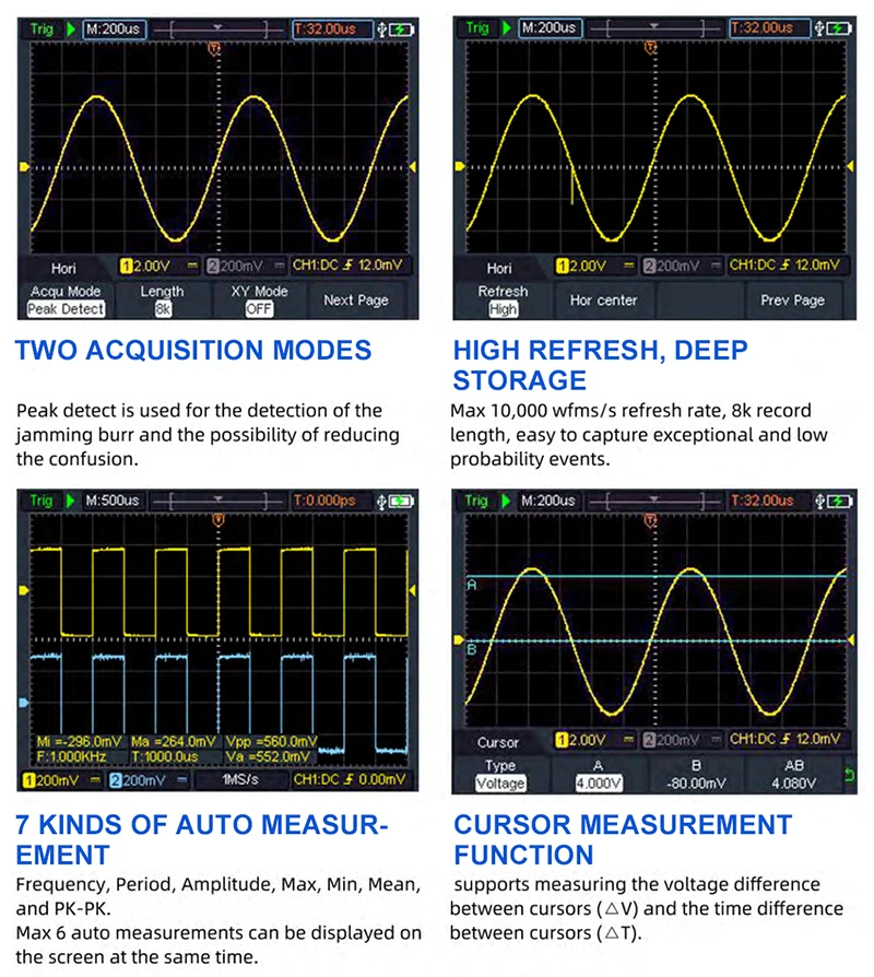 ✔Простой в использовании, снабжен 7 видами автоматического измерения-частота, период, амплитуда, Макс, мин, среднее и PK-PK, идеально подходит для профессионалов и новичков.