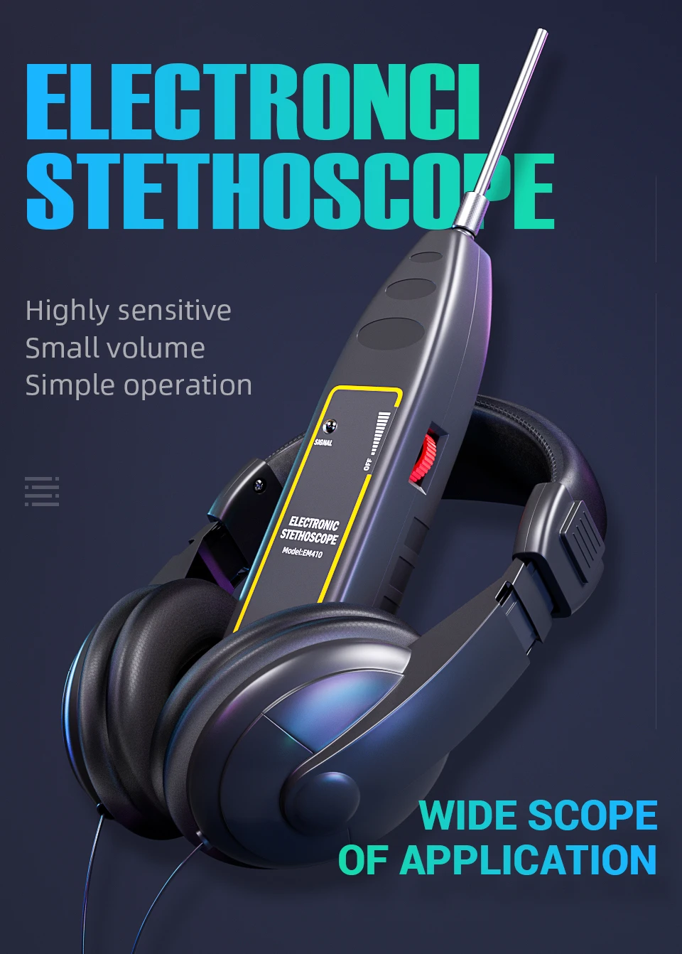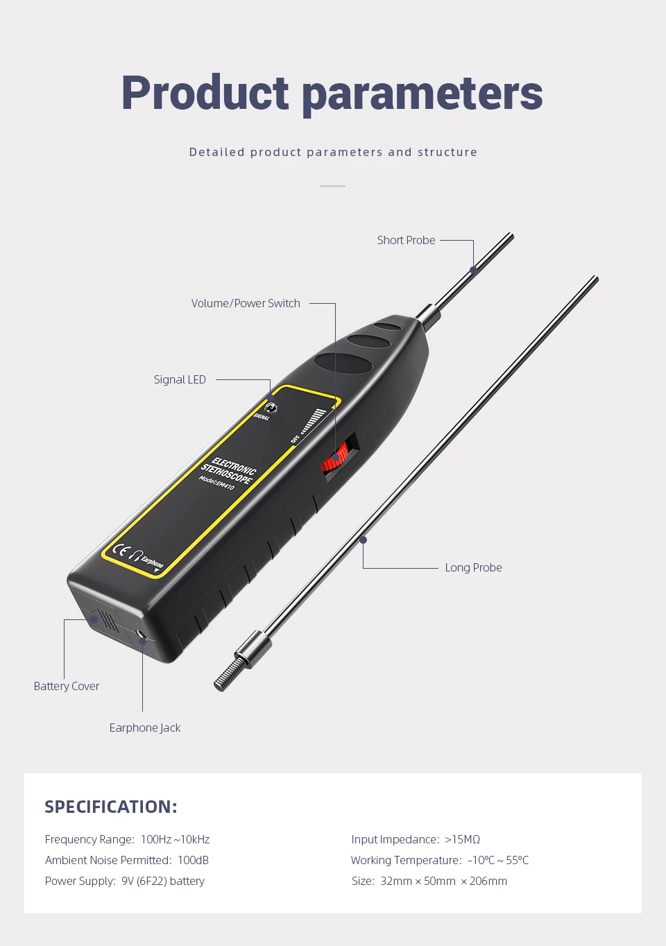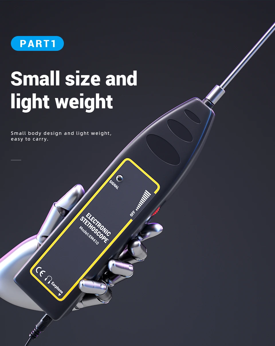7. Вы можете настроить переключатель громкости/мощности для желаемого объема. Коснитесь конца зонда до желаемого положения объекта, который вы хотите обнаружить. Обратите внимание на изменение звука От наушников. Наконец, вы можете найти место, где происходит определенный шум. Согласно опыту и соответствующим знаниям, вы можете найти раннюю скрытую проблему или положение, в котором существует неисправность.