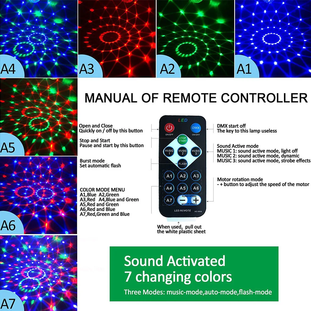 Вечерние огни с дистанционным управлением: поставляется с пультом дистанционного управления, вы можете использовать его для включения/выключения света, изменения режима активации звука/освещения и управления скоростью вращения/вспышки. Все функции на пульте дистанционного управления очень просты в использовании.