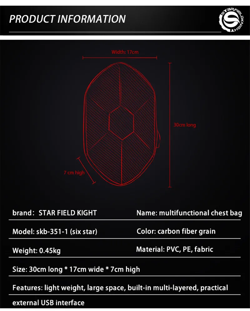 Description: Name: Multifunctional Chest Bag Color: Carbon Fiber Grain Material: PVC+PE+Fabric Feature 1: Six-Pointed Star Shape Feature 2: Waterproof