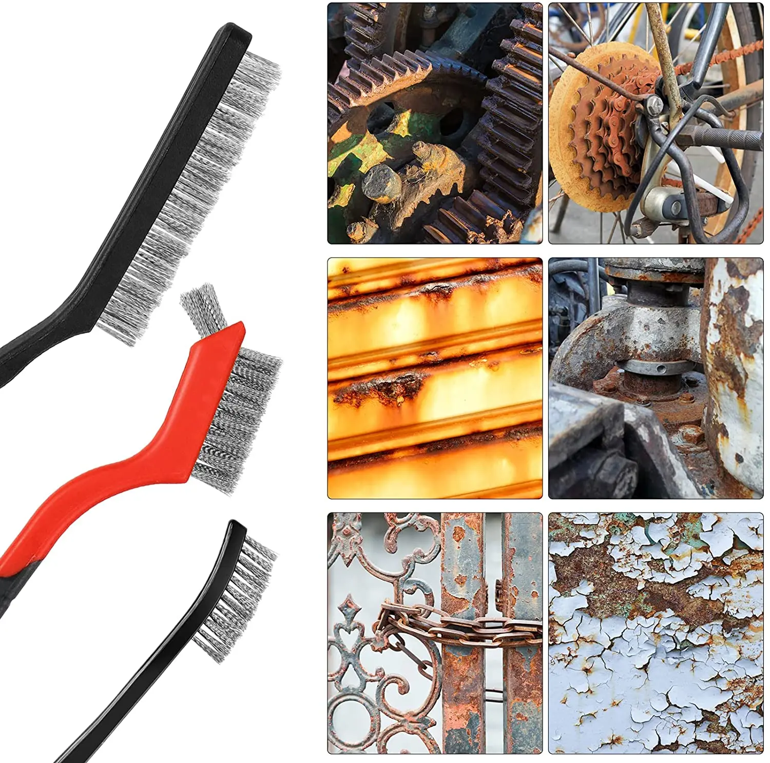 3 типа кистей: 2 шт. проволочных кистей из нержавеющей стали, 2 шт. медных проволочных кистей и 2 шт. нейлоновых щеток (3 шт. 7 дюймов кистей и 3 шт. 9 дюймов кистей)