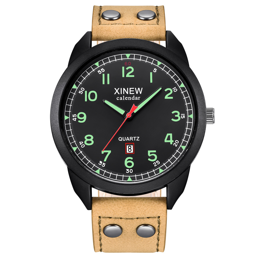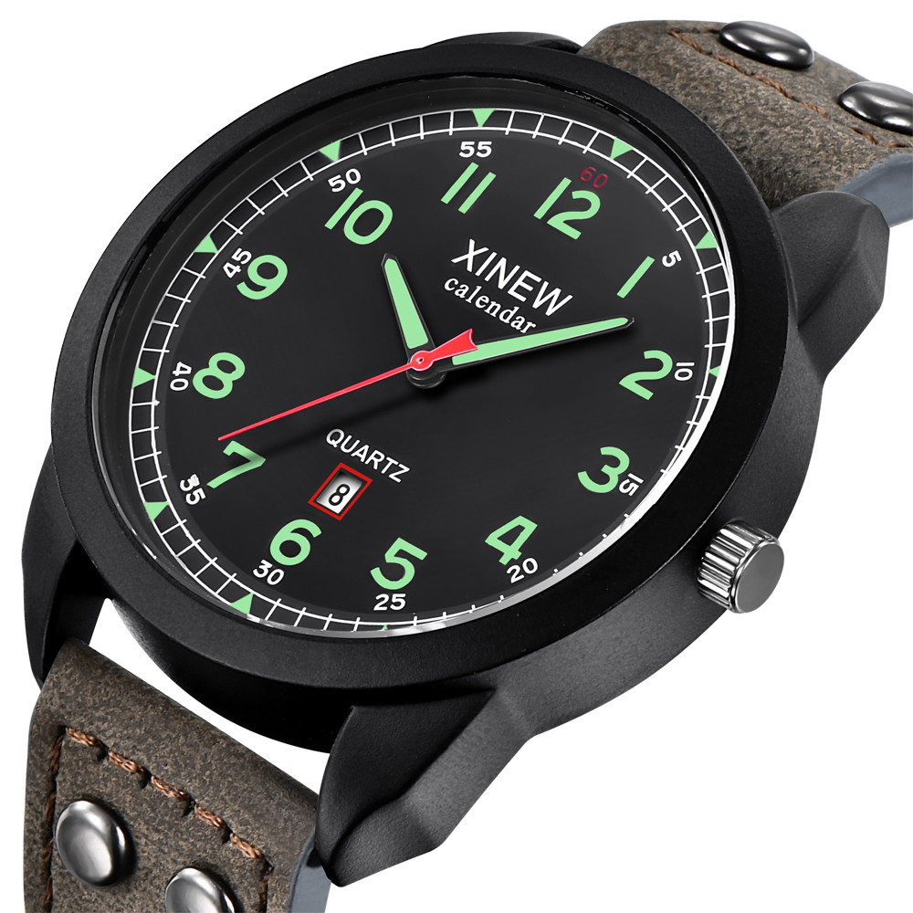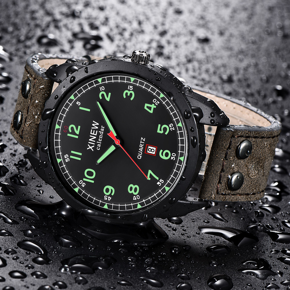 XINEW кожаный ремешок простой календарь светящийся циферблат наружные мужские кварцевые часы