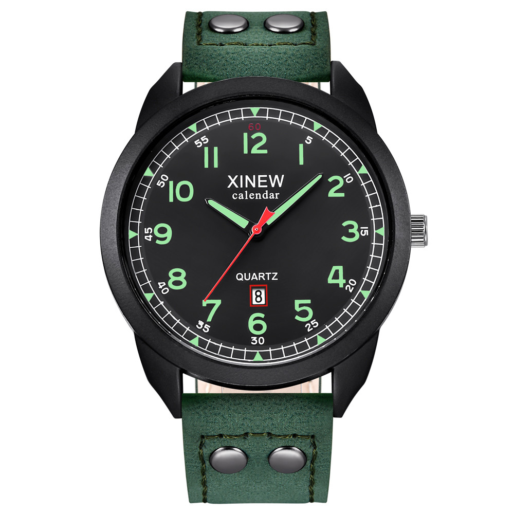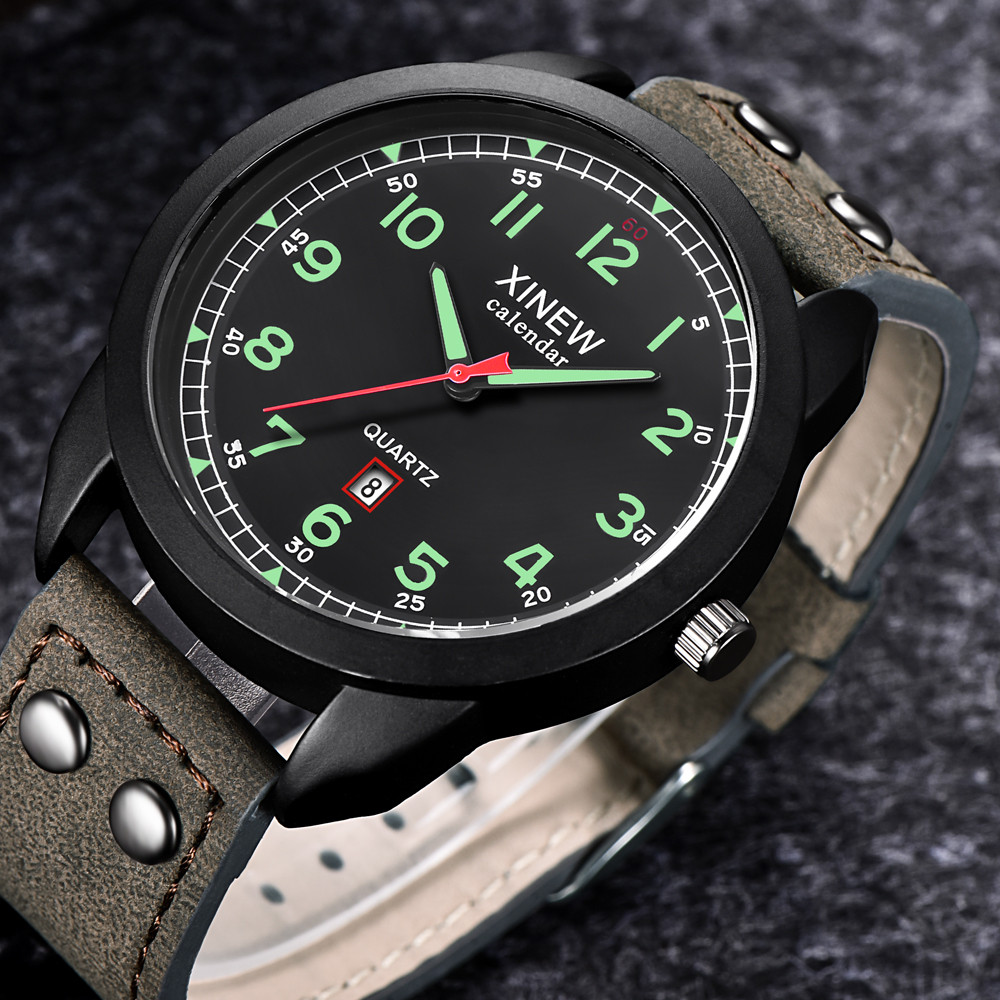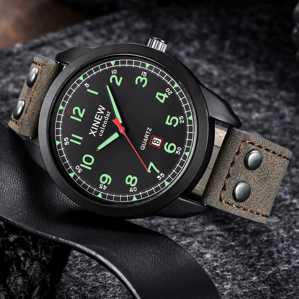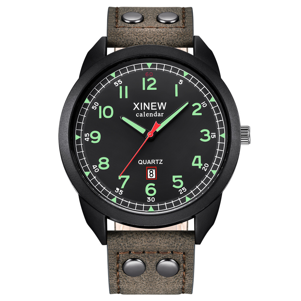 XINEW кожаный ремешок простой календарь светящийся циферблат наружные мужские кварцевые часы