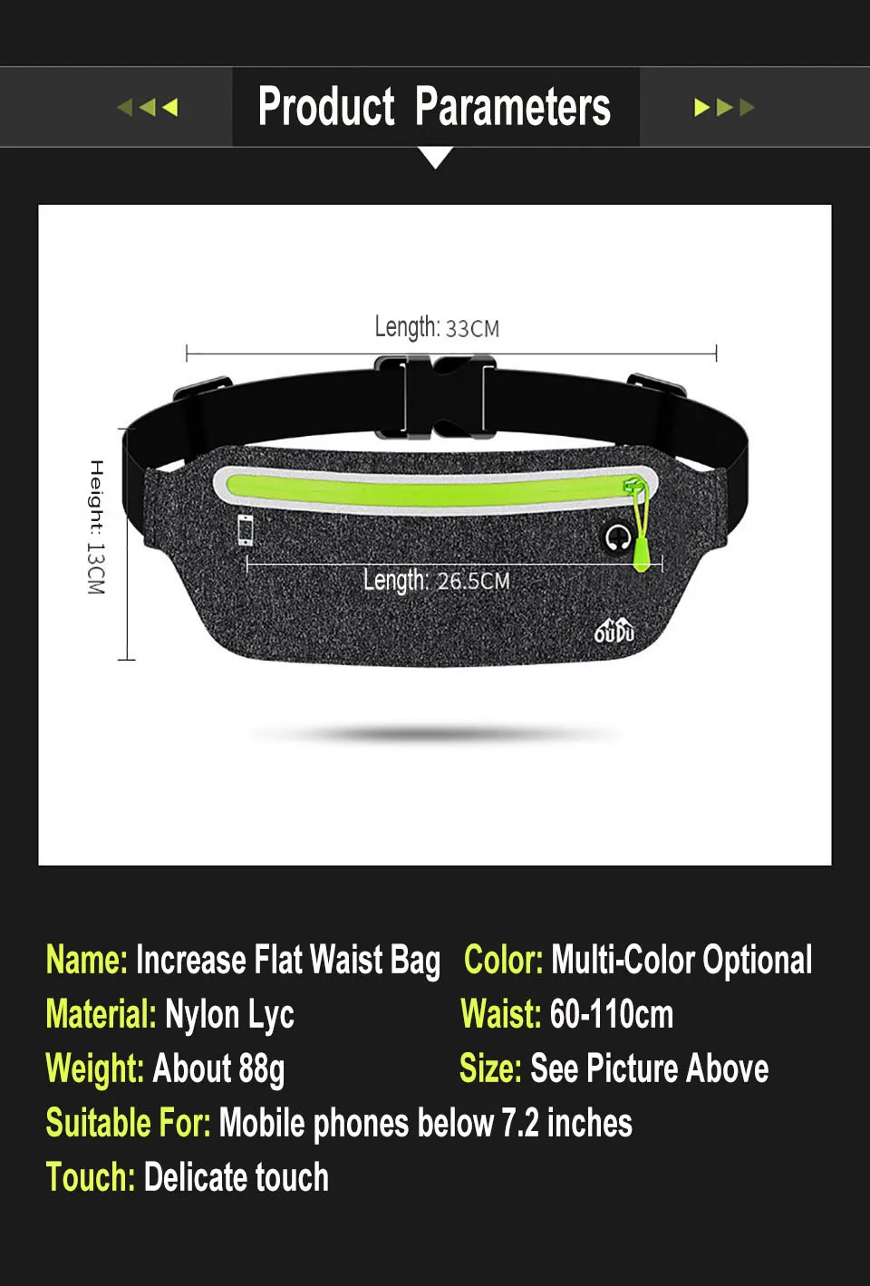 Спецификация: Бренд: KoKossi Модель: KD169 Наименование: увеличивающая рост сумка с плоской талией Материал: нейлон Lyc Цвет: 6 цветов для вас Обхват талии: 60-110 см Подходит для: мобильных телефонов ниже 7,2 дюйм (ов) Применение: тренажерный зал, бег, Велоспорт, марафон и т. Д. Посылка: 1 сумка для бега