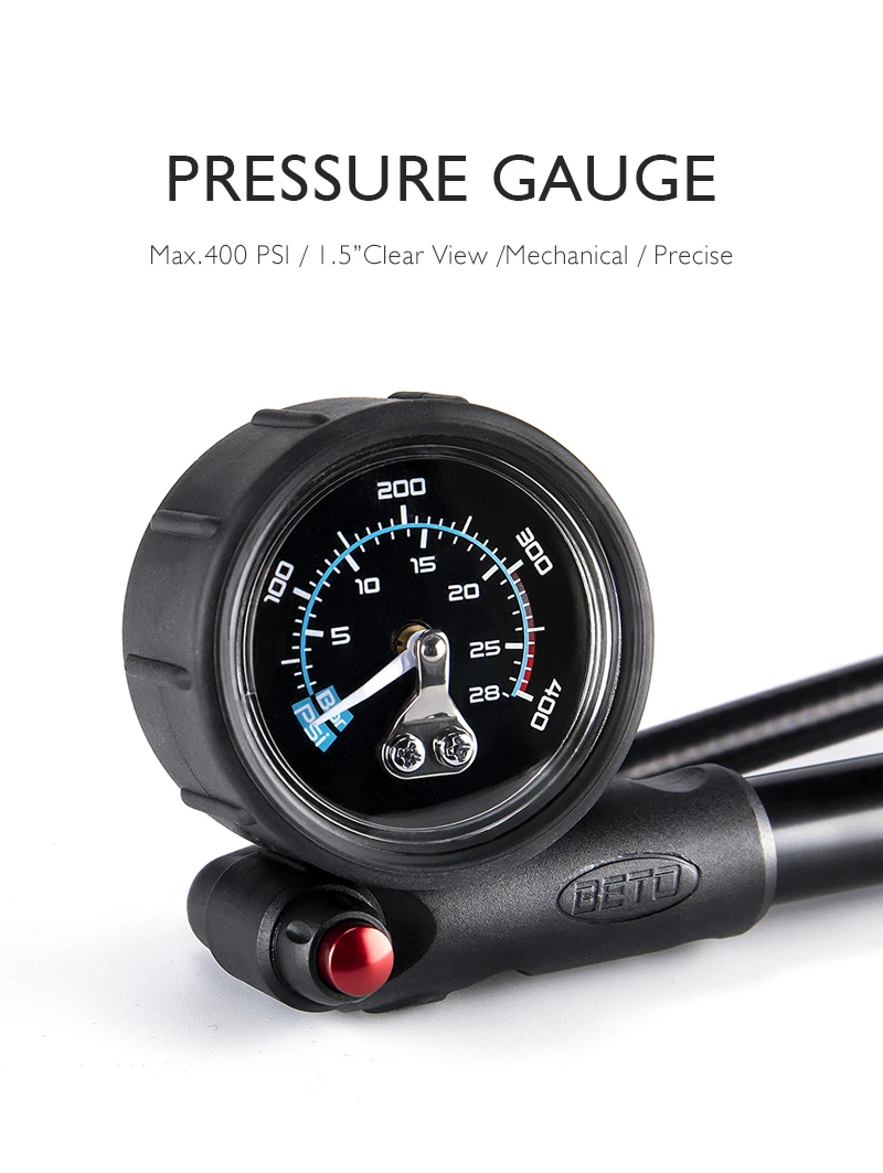 * 1.5 inches precise industry class gauge * Fine tuning pressure bleeder button * Swivel hose for easy pumping * 2-Stage non-leakage head * Patented Pinch free T handle * 400 PSI / 28 BAR capable