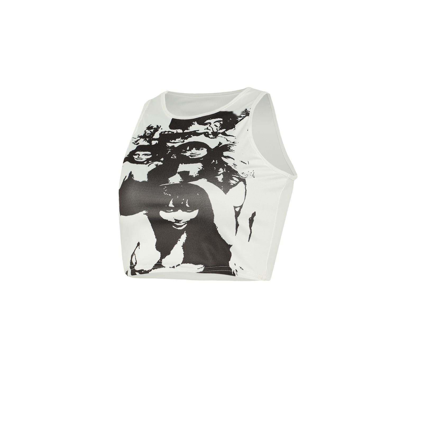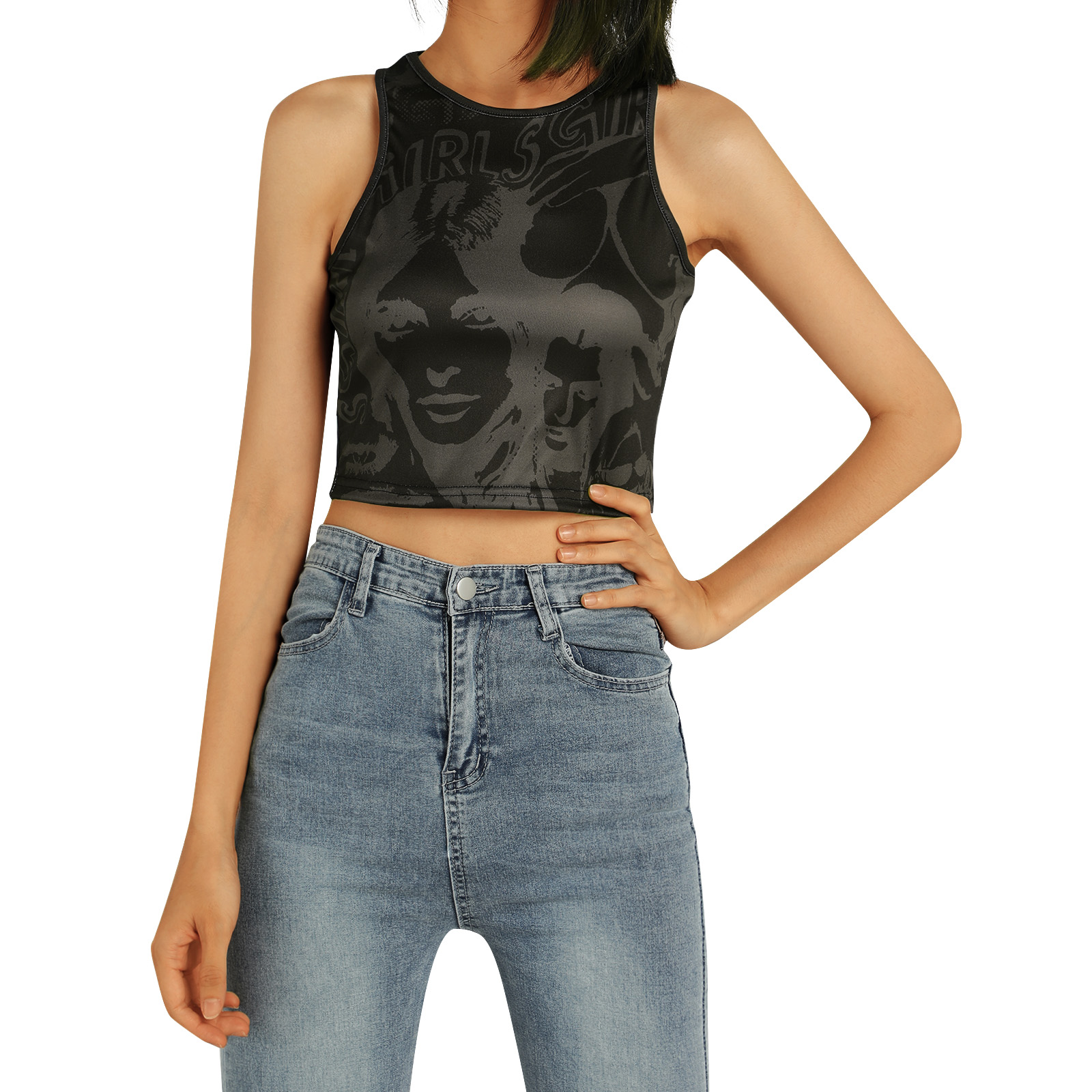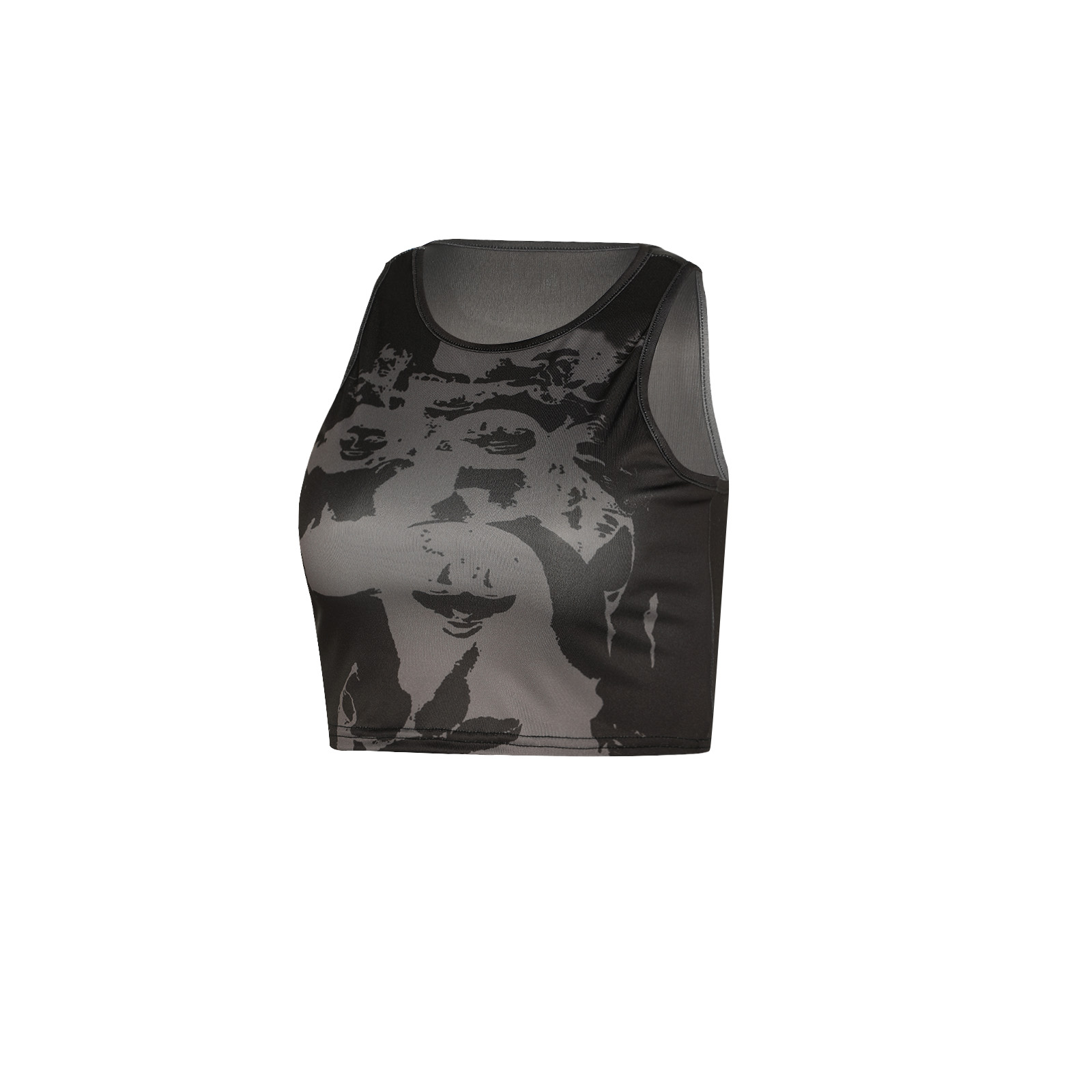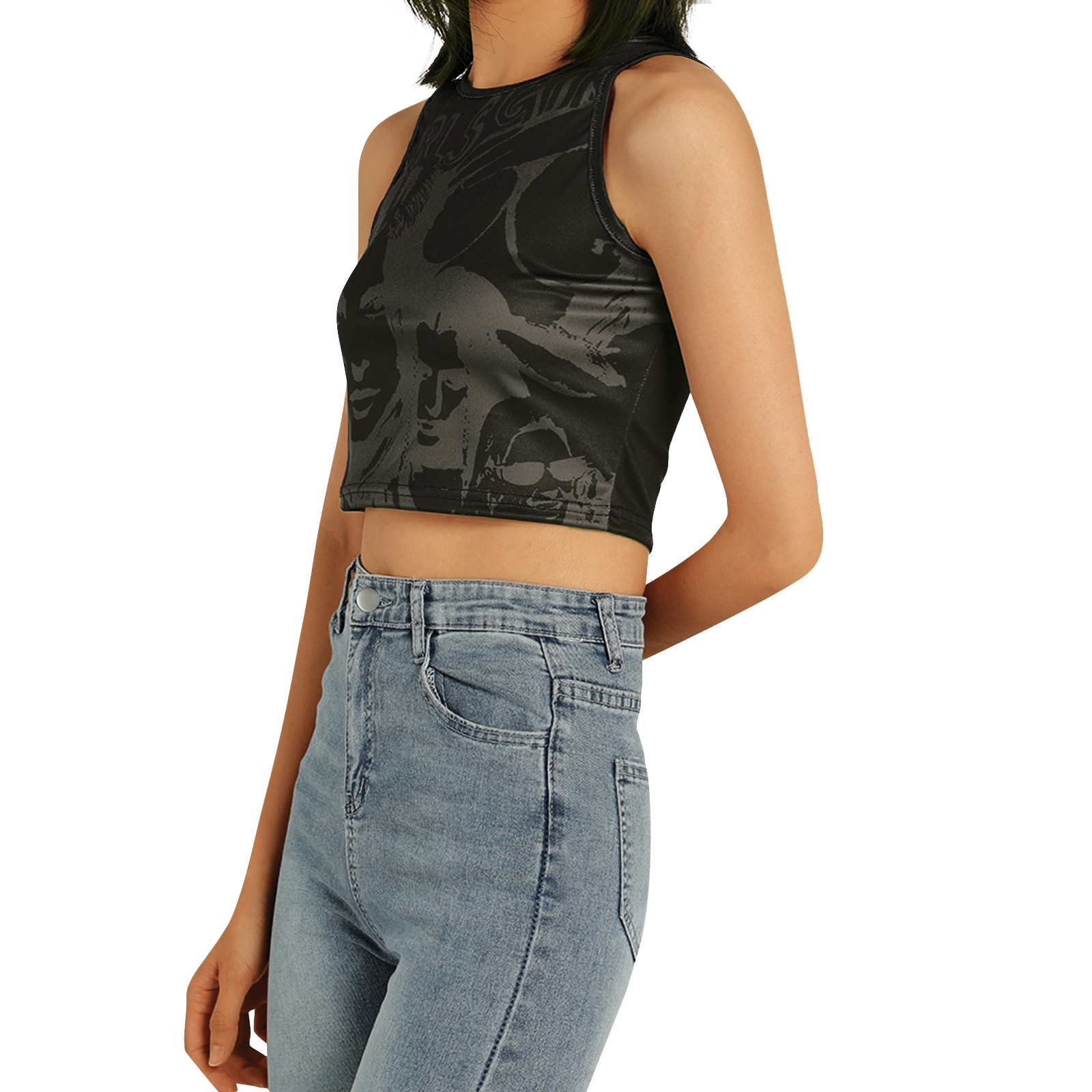 Этот женский жилет имеет шикарный принт головы, облегающий крой и классический круглый вырез.