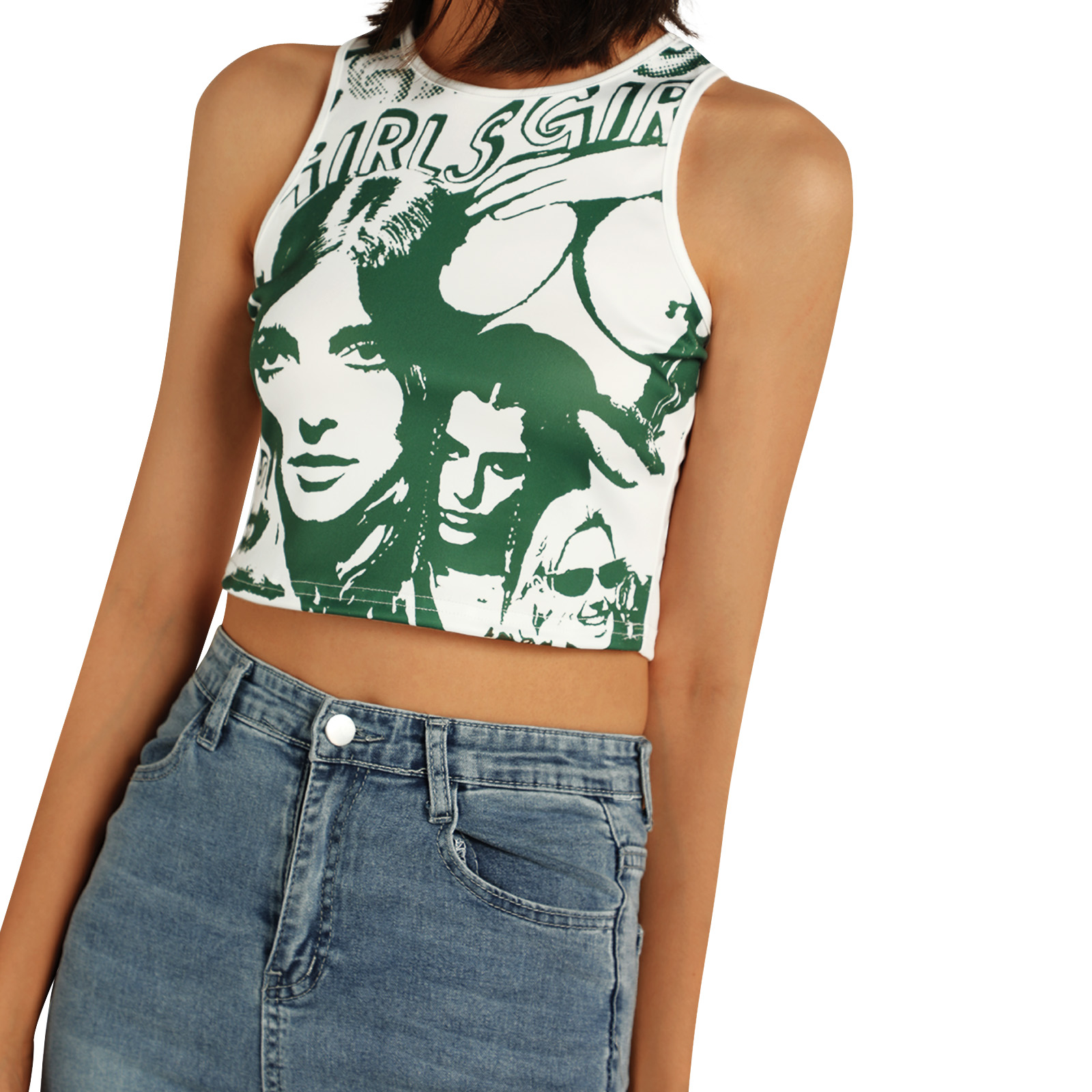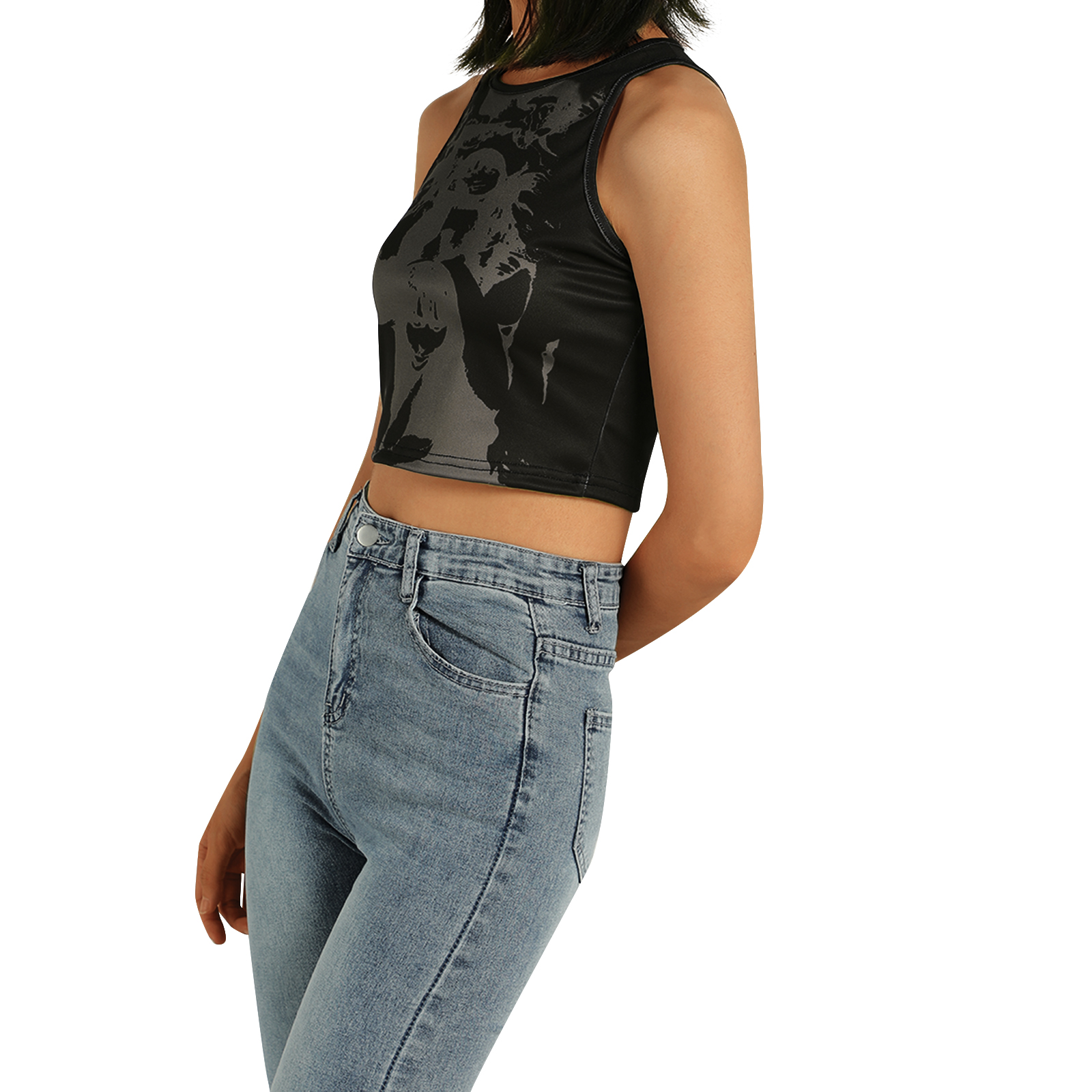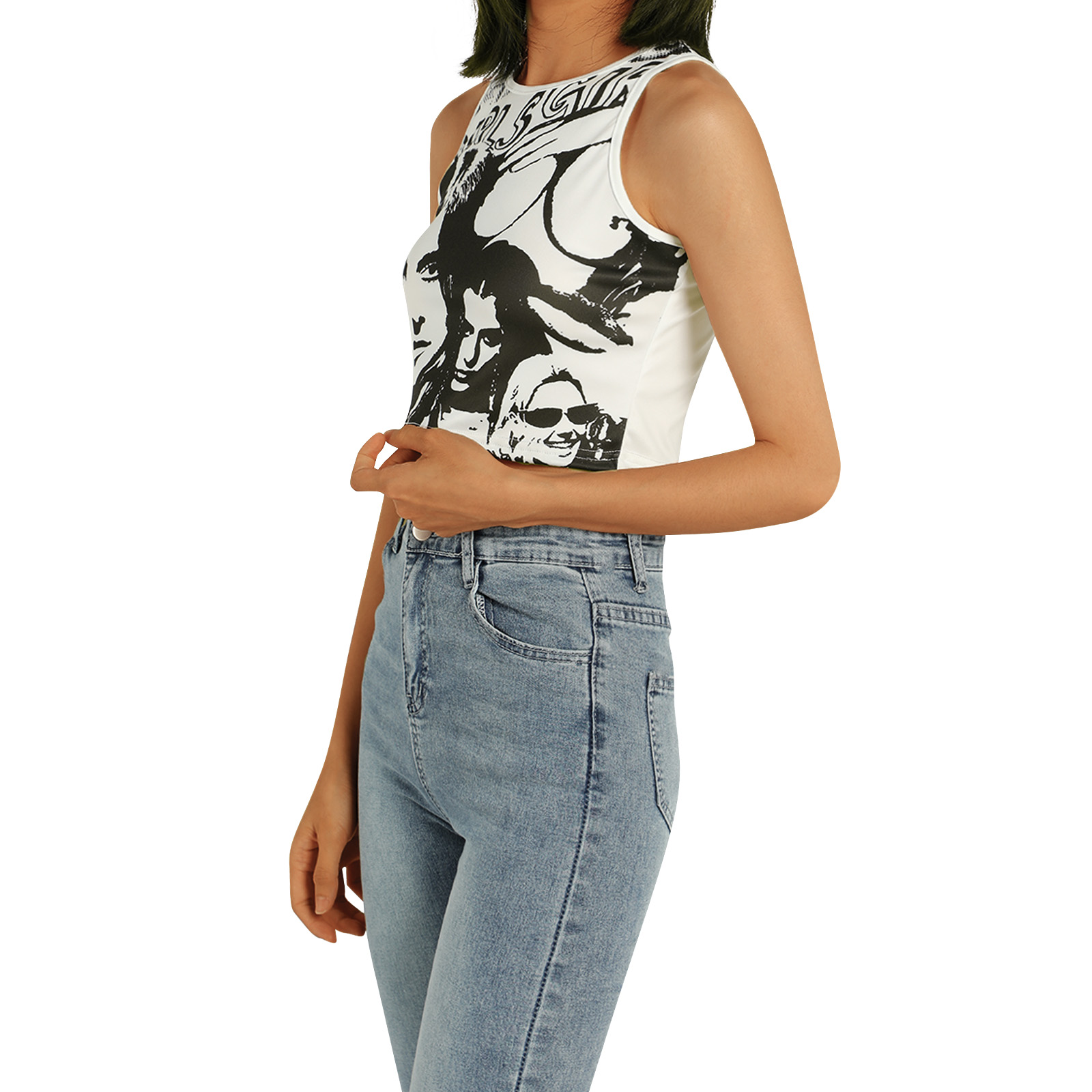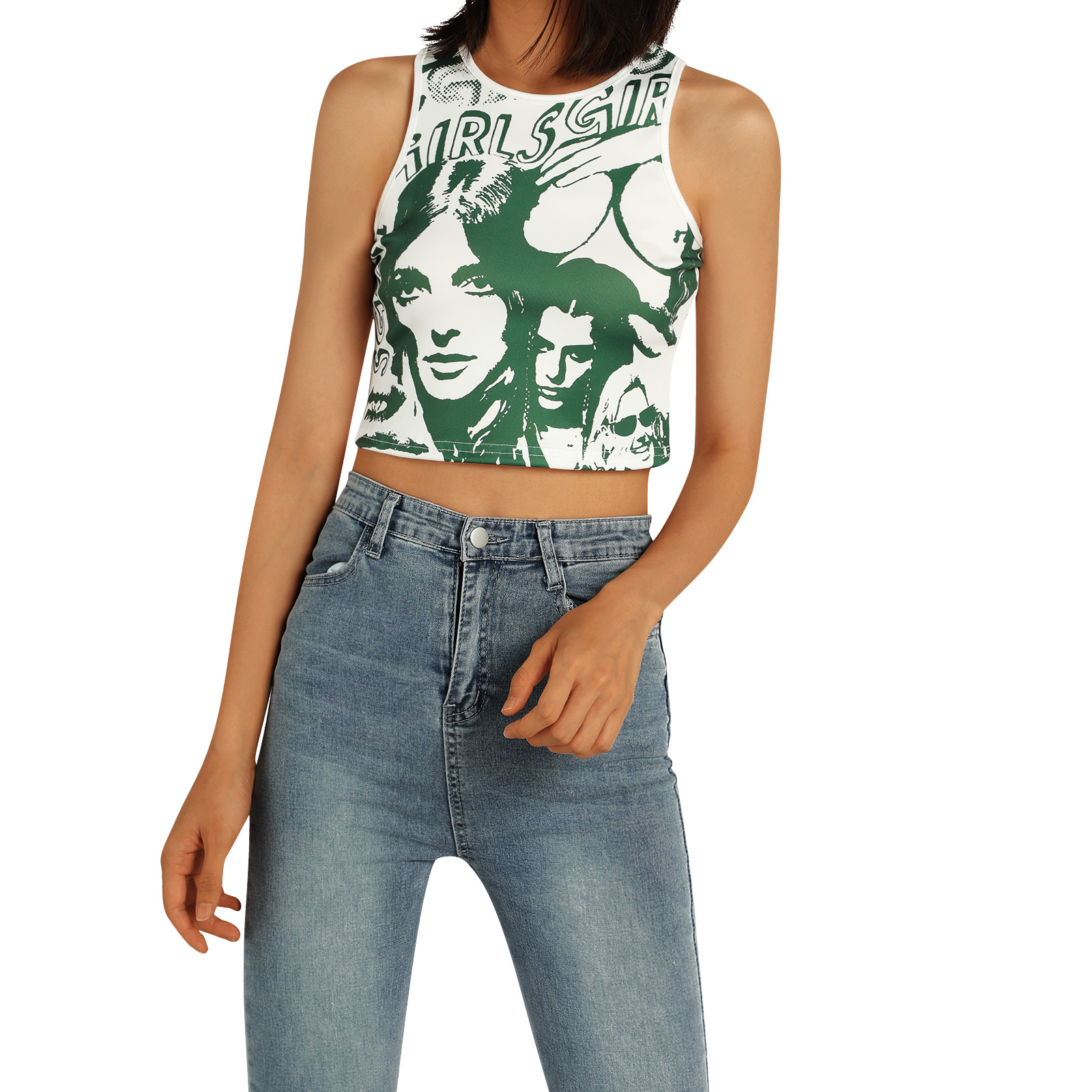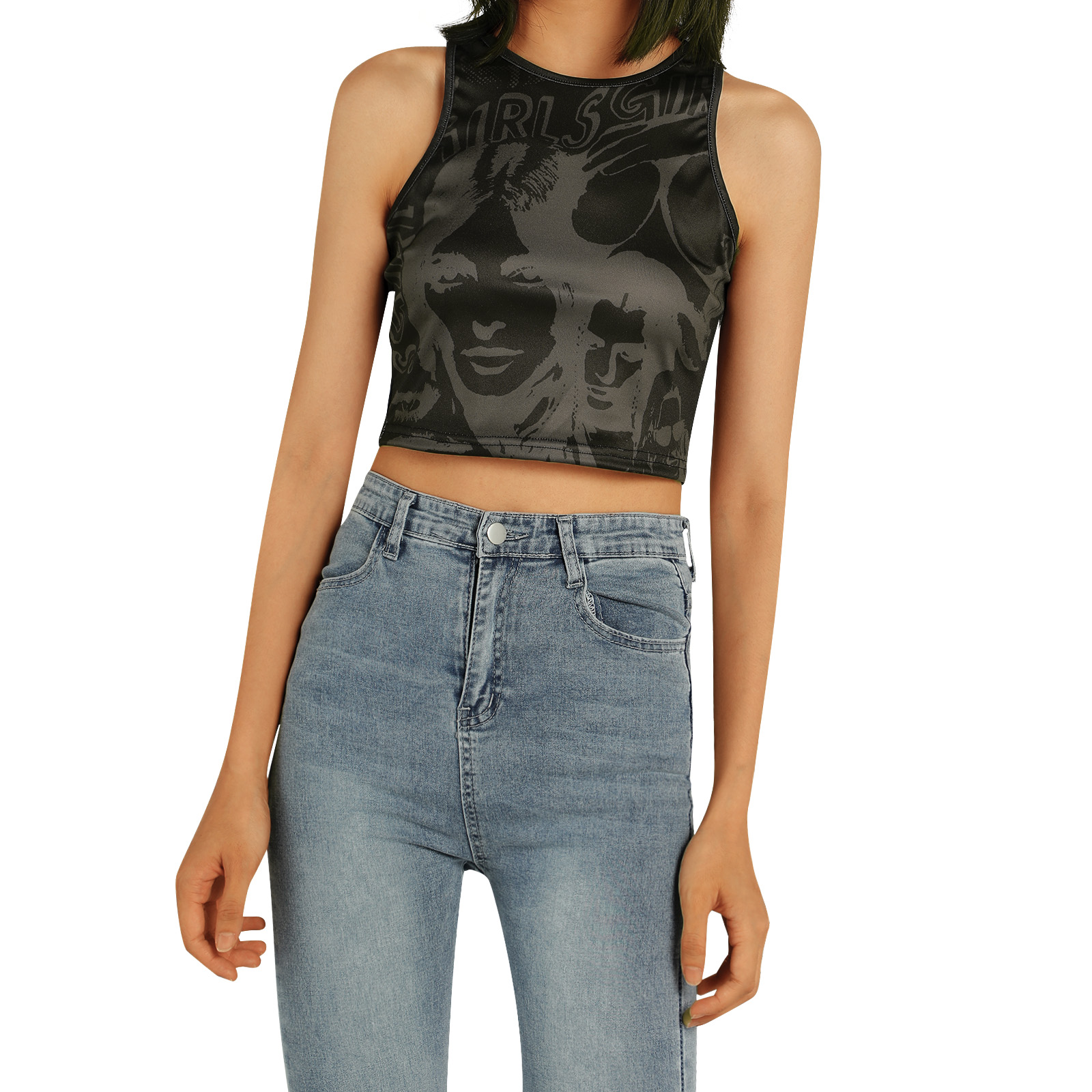 Этот женский жилет имеет шикарный принт головы, облегающий крой и классический круглый вырез.