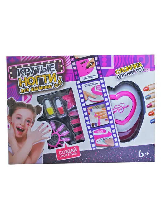 Game set for creating a manicure with a nail dryer. A great gift for a small fashionista. The set has a nail polish file, a manicure stencil, a manicure dryer, 3 colors, a brush for polishing nails.