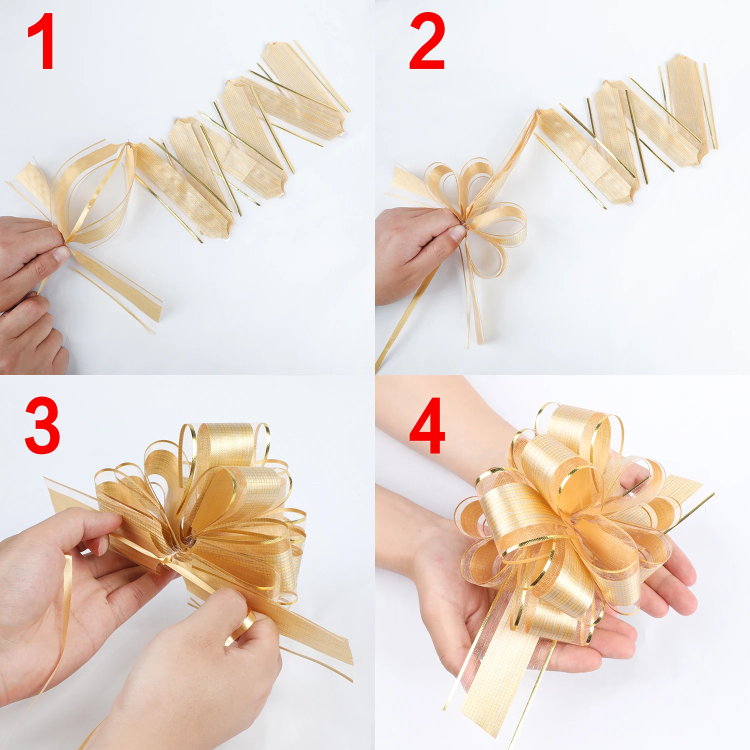 Легко собрать: каждый Натяжной бант состоит из 8 штук мелких деталей, которые прочно закреплены пластиковыми кольцами. После открытия бантов вы можете найти 2 свободные ленты с обеих сторон, вы можете тянуть одну ленту медленно и удерживать другую. Возьмите узел, а затем красивый бант из ленты. (Вы можете следовать инструкциям на фотографии сборки.)