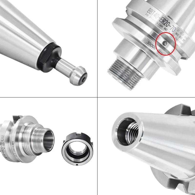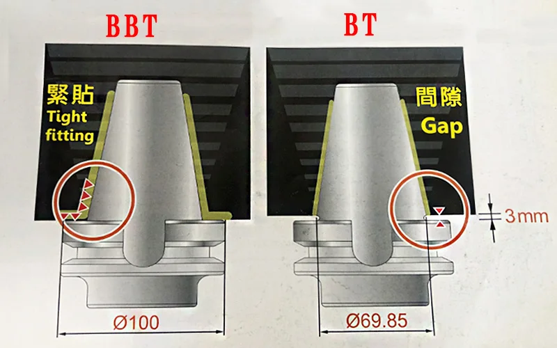 Повышенная стабильность, чтобы избежать увеличения отверстия и плохого acuracy патрона шпинделя во время высокоскоростной резки. Большая площадь контакта позволяет увеличить скорость расширения, повысить стабильность инструмента и увеличить срок службы инструмента. После замены режущего инструмента серия BBT может оставаться такой же повторяемостью и округлостью.