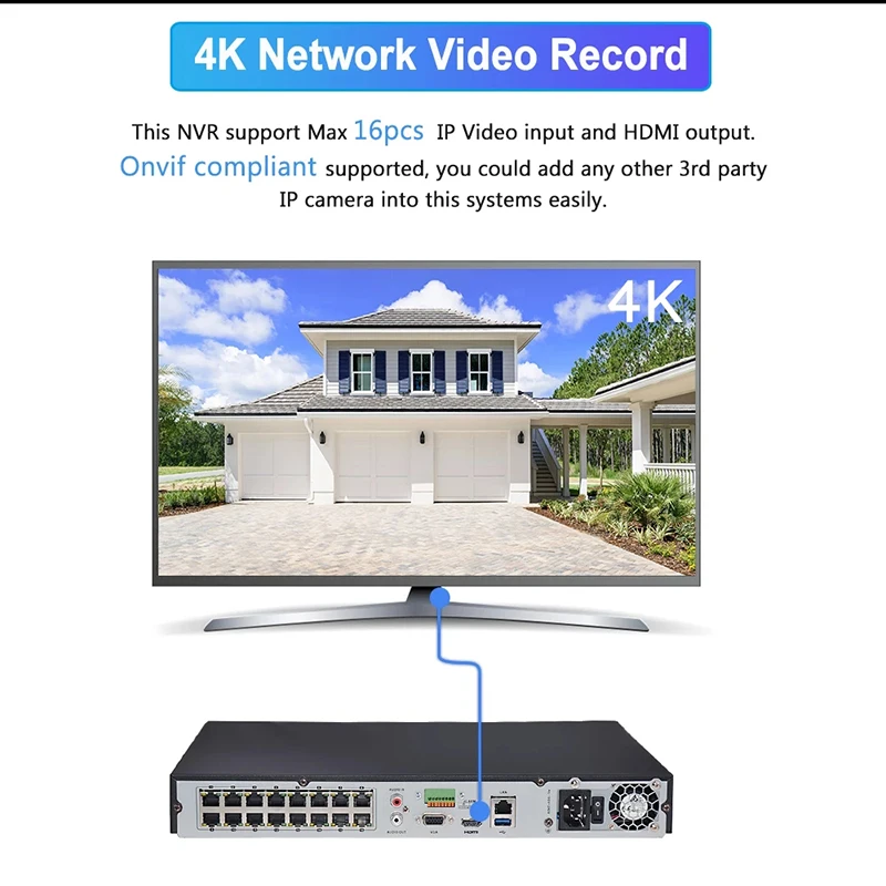 2. Этот NVR поддерживает до 128 удаленных соединений. Аудио вход и выход RCA обеспечивают двустороннее аудио. Порт HDMI и VGA позволяет выводить видео на внешний монитор (доступен отдельно) с разрешением до 4K UHD. Соответствие профилям ONVIF S и T обеспечивает совместимость с ip-камерами ONVIF.