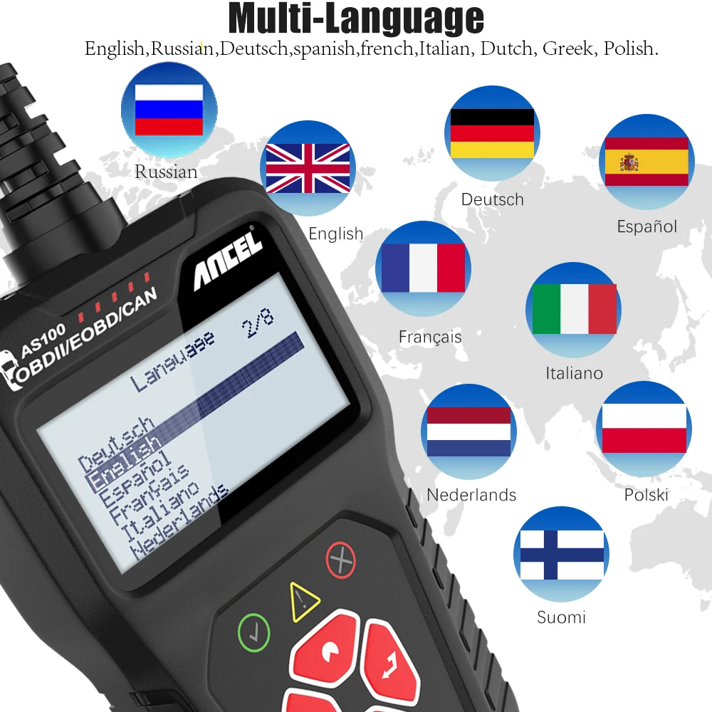 Ancel AS100 OBD2 сканер поддерживает языки: