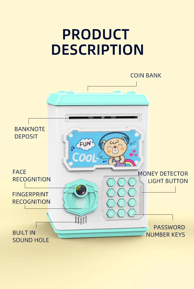 Название: копилка для распознавания лиц Подходящий возраст: 3 года и старше Материал: АБС-пластик Размер: 19,6*12,9*12,9 см Цвет: розовый, синий, желтый Особенности: Распознавание лиц, блокировка цифрового кода, обнаружение денег, определение отпечатков пальцев и возврат денег Примечание: * Из-за светильник экране монитора фактический цвет, цвет товара может быть s светильник ly отличается из-за характеристик монитора компьютера. * Замеры сделаны вручную, поэтому возможны 0,5-1 мм разницы в связи с тем, что измерения выполнены вручную.