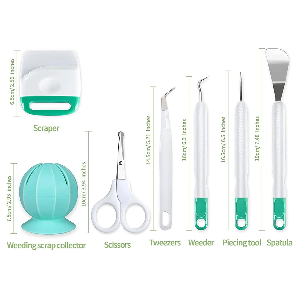 -Набор инструментов из 6 предметов содержит все важные инструменты, необходимые для подъема, резки, сглаживания и удаления самых разнообразных материалов. Используйте крючок и прямые weeders для удаления нежелательных железных и виниловых деталей или вытыкайте крошечные отрицательные части. И шпатель точно поднимет материалы с вашего режущего коврика. Скребок может быть использован для сглаживания наклеек и нежелательных царапин с вашего режущего коврика. Пинцет позволяет легко поднимать порезы. Острые Ножницы очищают материалы.