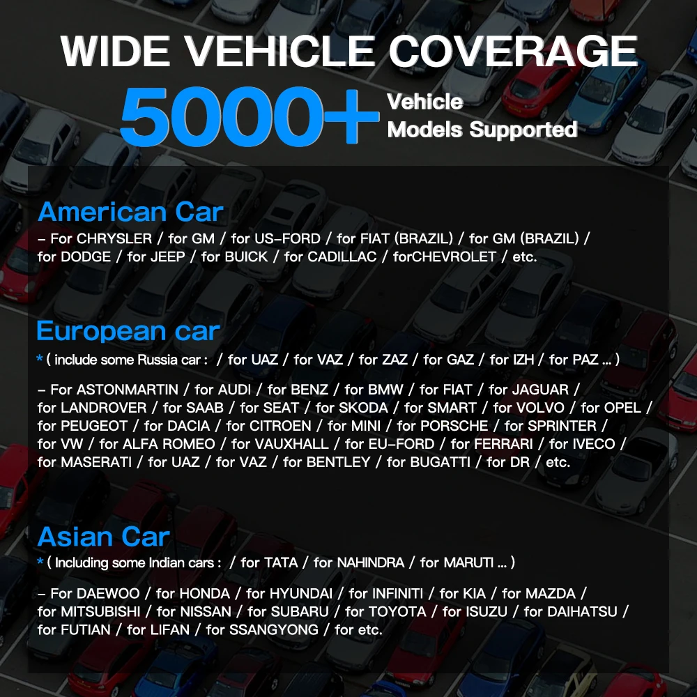 Азиатский автомобиль: -DAEWOO, HONDA, HYUNDAI, INFINITI, KIA, MAZDA, MITSUBISHI, NISSAN, SUBARU, TOYOTA, ISUZU, DAIHATSU, futan, LIFAN, SSANGYONG и т. д. Американский автомобиль: -CHRYSLER, GM, US-FORD, FIAT (Бразилия), GM (Бразилия), DODGE, JEEP, BUICK, CADILLAC, CHEVROLET и т. д. Европейский автомобиль: -ASTONMARTIN, AUDI, BENZ, BMW, FIAT, JAGUAR, LANDROVER, SAAB, SEAT, SKODA, SMART, VOLVO, OPEL, PEUGEOT, DACIA, CITROEN, MINI, PORSCHE, SPRINTER, VW, ALFA ROMEO, VAUXHALL, EU-FORD, FERRARI, IVECO, MASERATI, UAZ, VAZ, BENTLEY, BUGATTI, DR и т. Д. Если вы не знаете, нужна ли функция поддержки вашего автомобиля, пожалуйста, оставьте нам сообщение в формате ниже (например: xx, 2005, 2.0cc, Diesel, Я хочу сделать xx функцию), я проверю для вас.