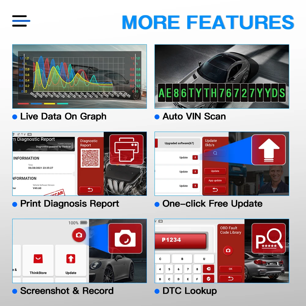1. Прямые данные на диаграмме Таблица четко показывает и помогает быстро решить проблему 2. Автоматическое сканирование Вам больше не нужно вручную вводить код VIN, автоматически сканировать, чтобы быстро получить информацию о транспортном средстве 3. Отчет о диагностике печати 4. Одно нажатие бесплатное обновление 5. Скриншот и запись 6. Поиск DTC
