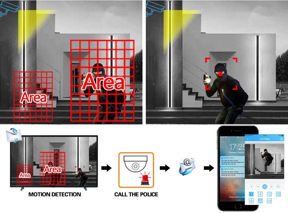 Можно настроить область, которую вы хотите контролировать, когда она срабатывает, она отправит сообщение на вашу электронную почту, вы можете получить информацию из первых рук, независимо от того, когда и где вы находитесь.