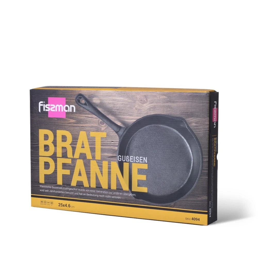 Компания FISSMAN, являясь одним из лидеров мирового посудного рынка, производит изделия, отвечающие самым высоким стандартам качества, безопасности и экологичности.Сохраняя традиции и осваивая новые технологии, FISSMAN предлагает серию чугунной посуды. У современного человека есть широчайшие возможности выбора способов и средств для приготовления еды. Но про классическую чугунную посуду, которая передается из поколения в поколение, недаром говорят, что она проверена веками и до сих пор не потеряла актуальности.Бесспорное первенство старый добрый чугун заслужил благодаря очевидным достоинствам: • Долговечность – посуда при надлежащем уходе прослужит длительное время • Энергосбережение - сохраняет тепло в течение длительного времени • Естественные антипригарные свойства – усиливаются в процессе постоянного использования • Универсальность - можно готовить на плите любого типа, в духовом шкафу, на гриле и на открытом огне. • Толстые стенки способствуют равномерному распределению тепла, и исключают деформацию от перегрева или падений • Дополнительная ручка позволяет равномерно распределить вес тяжелой сковороды и повысить удобство ее перемещения • Носики для слива позволяют сливать лишнюю жидкость и масло • Безопасно для здоровья и окружающей среды • Одобрено профессионалами.Приобретая продукцию компании FISSMAN, вы делаете выбор в пользу качества, здоровья и безопасности. Творите, пробуйте новое, балуйте себя и любимых. FISSMAN желает вам успехов на кулинарном поприще!