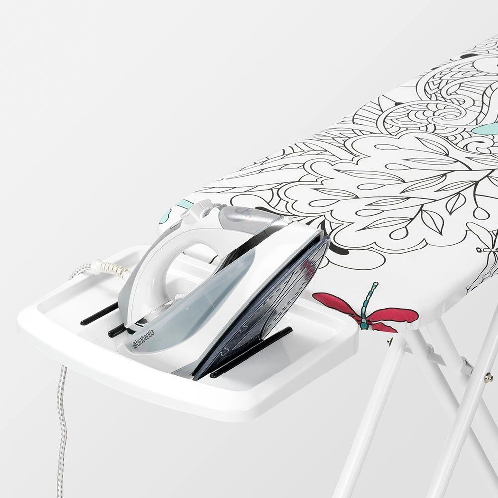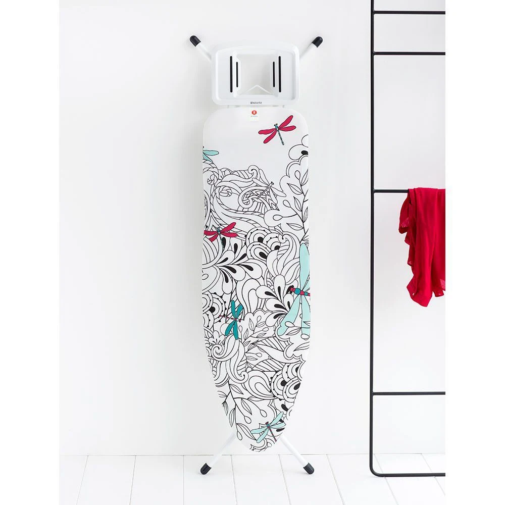 The board has a wide table top and is suitable for all common types of steam irons. • Protection of the iron from damage-a strong stand for steam iron with thermal-resistant anti-slip protective pads. • Stable table top-sturdy frame on 4 legs (22mm diameter steel pipe). • Durable-"floating" mesh design protects the board from deformation when exposed to high temperatures. • Standard model for quick and comfortable ironing. • Convenient in carrying and storing-the function of fixing in the folded position. • Ergonomic-height adjustment in 7 positions (69 - 96 cm). • Cover of 100% cotton with elastic foam lining. • Increased safety for children-safety lock, preventing accidental folding of the board. • Durable protective anti-slip caps. • Brabantia covers (size B) are suitable for this model. • 10-year warranty Brabantia.