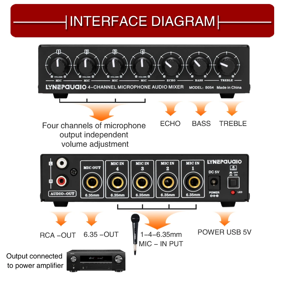 4 входных интерфейса для микрофона (6,35 мм), могут быть подключены к 1 ~ 4 проводному микрофону.