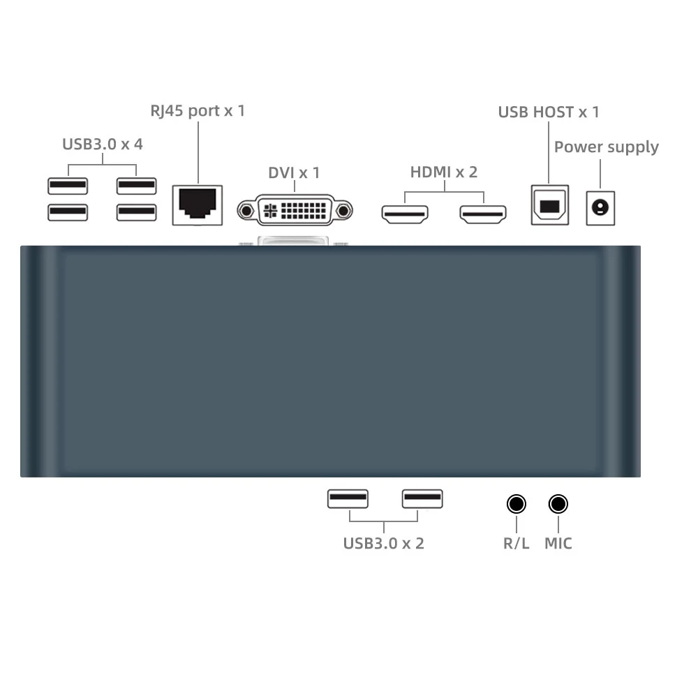 Этот продукт может расширить интерфейс USB3.0 ноутбука до 12 дополнительных интерфейсов в одной остановке, и нужен только usb-кабель для подключения периферийных устройств к ноутбуку, эффективное решение проблемы недостаточности интерфейсов, вызванной портативным дизайном компьютера. Этот продукт может добавить монитор DVI и два монитора HDMI с тем же изображением, что может максимизировать эффективность работы и расширить рабочее пространство. Очень подходит для использования в офисе, таких как электронная почта, веб-приложения, Microsoft office и т. д. Передняя часть этого продукта разработана с интерфейсом USB, стереозвуком и входным интерфейсом микрофона, что удобно для частого ввода и удаления каждый день.