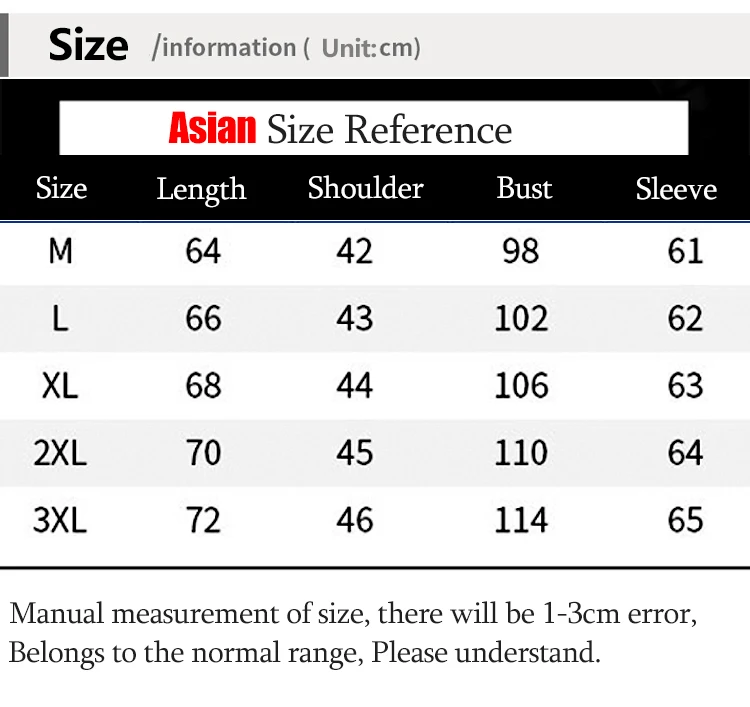 1. Это китайский Размер, примерно на 1-2 размера меньше, чем Европейский/американский размер. Если вы носите Европейский/американский размер L, вы можете выбрать наш Размер XL или XXL. 2. Как измеряется вручную; Погрешности могут составлять 1-3 см разницу допускается (1 см = 0,39 дюймов). 3. В фотографировании товара будет ошибка цвета и на дисплее компьютера/мобильный телефон. Пожалуйста, учитывайте разумную разницу в цвете. 4. Как правило, мы можем отправить ваш заказ в течение 3 дней после оплаты, если нет, пожалуйста, свяжитесь с нами, чтобы проверить проблему