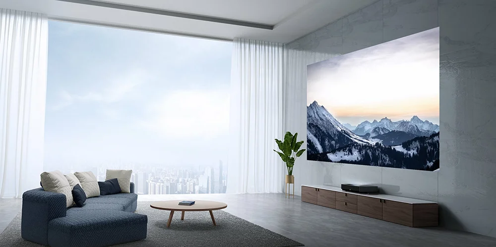 Лазерный ТВ 4K Cinema Pro, яркость экрана увеличивается более чем на 20% *, достигая 2400 ANSI люменов (офисный режим), представление в помещении неба более ослепительное.