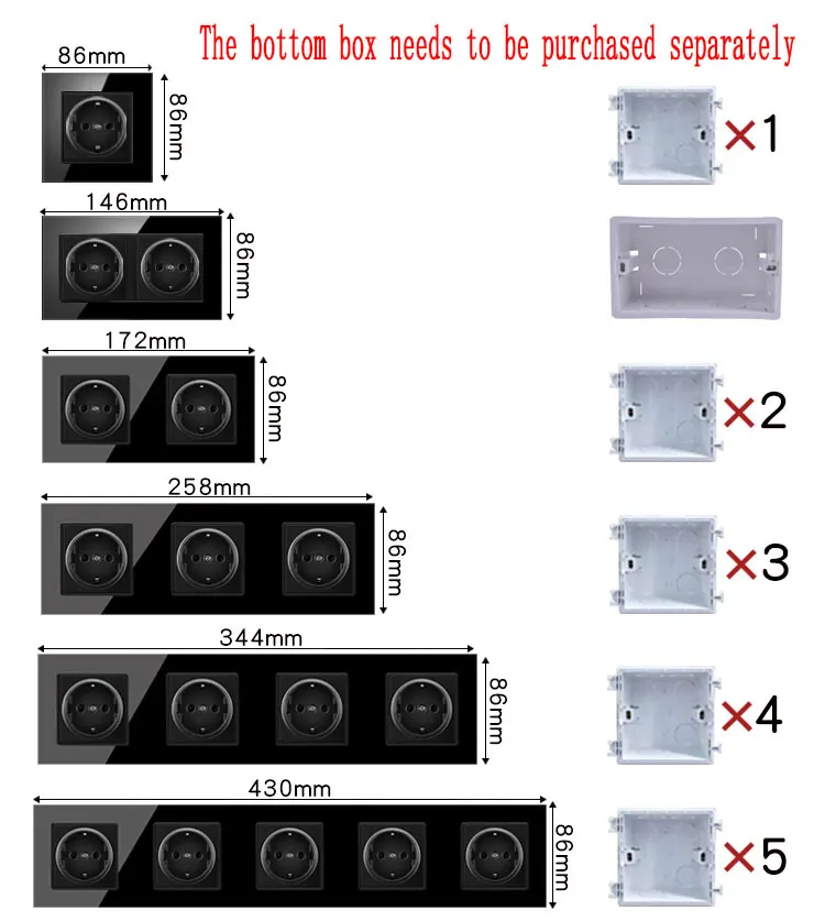 1. С 1 или двойным немецким модулем гнезда 2. Номинальное напряжение (ы): 100 ~ 250 В переменного тока/50 ~ 60 Гц 3. Номинальный ток: 16A 4. Обеспечение заземления: с заземлением свяжитесь 5. Степень защиты от электрического удара: с повышенной защитой 6. Тип клемм: Встроенные винты типа 7. Размеры: 176 мм * 86 мм/258*86 мм/344*86 мм/430*86 мм 8. Цвет: Белый/черный/шампанское золото/серый 9. Материал панели: закаленное Хрустальное стекло 10. Стандарт розетки: Европейский или немецкий стандарт Schuko