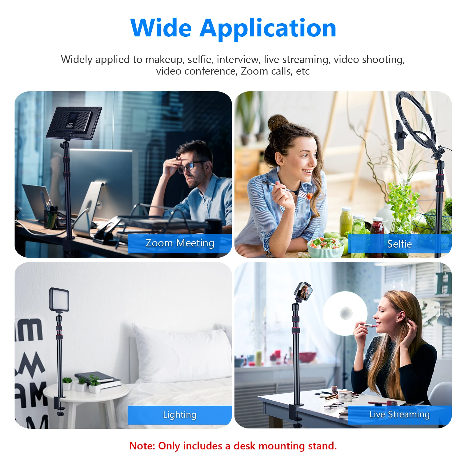 Прикрепите устройство с внутренней резьбой 1/4 ”К подставке и установите подставку на стол толщиной до 2”. Удобный аксессуар для макияжа, интервью, потоковой передачи игр, видеосъемки на Ютубе, освещения видеоконференции, освещения масштабирования и прямого вещания.