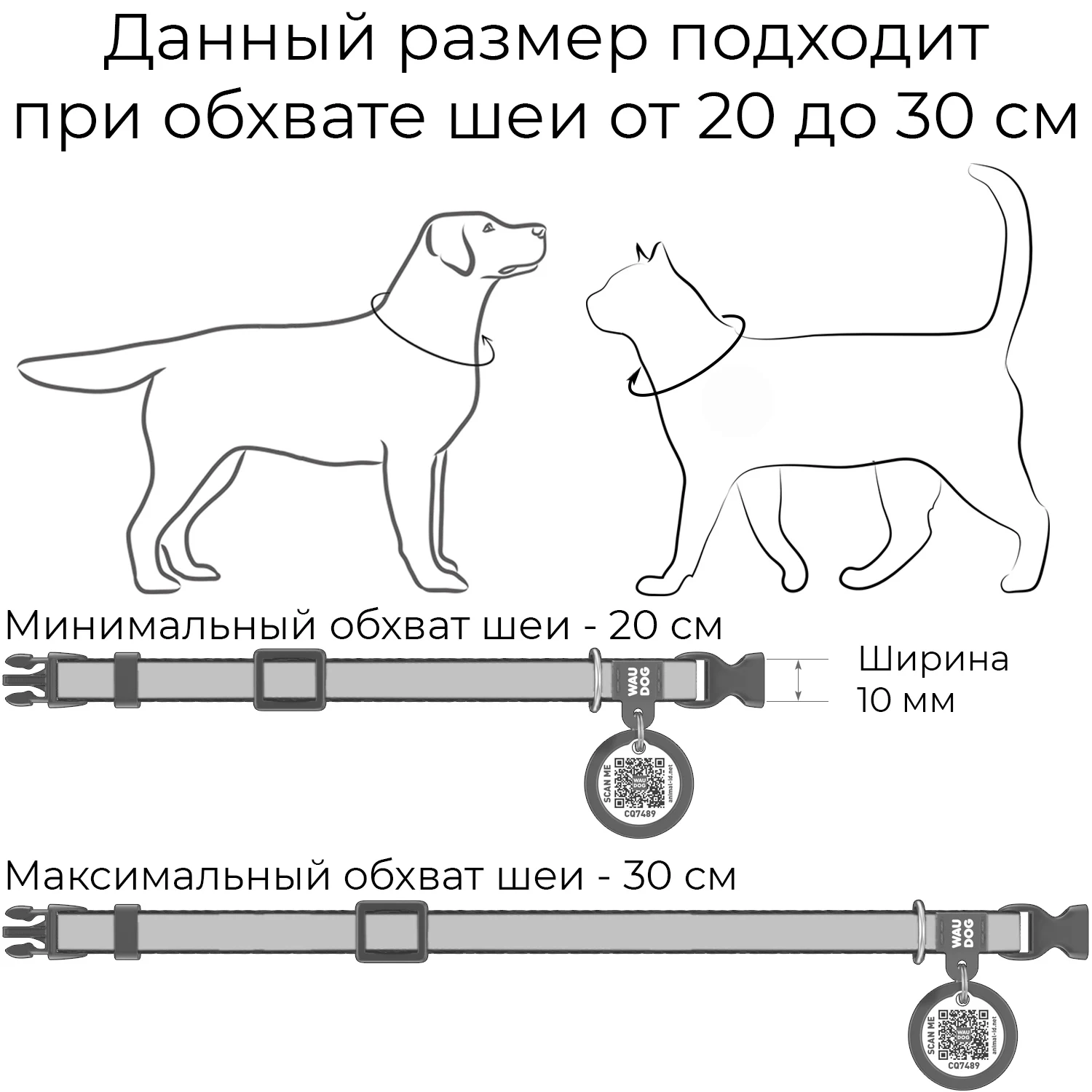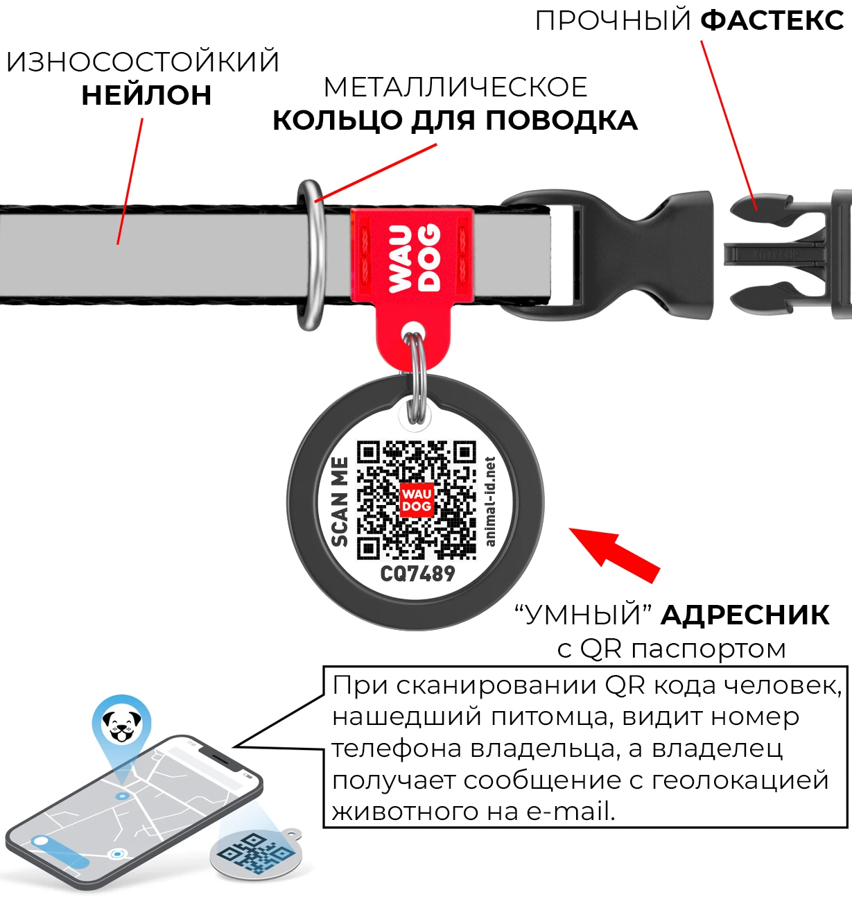 Нейлоновый ошейник для мелких пород собак и котов укомплектован «умным» адресником с QR кодом, который дает владельцу возможность не только быстро вернуть себе потерявшегося питомца, но и создать ему электронный паспорт. Инструкция по активации прилагается