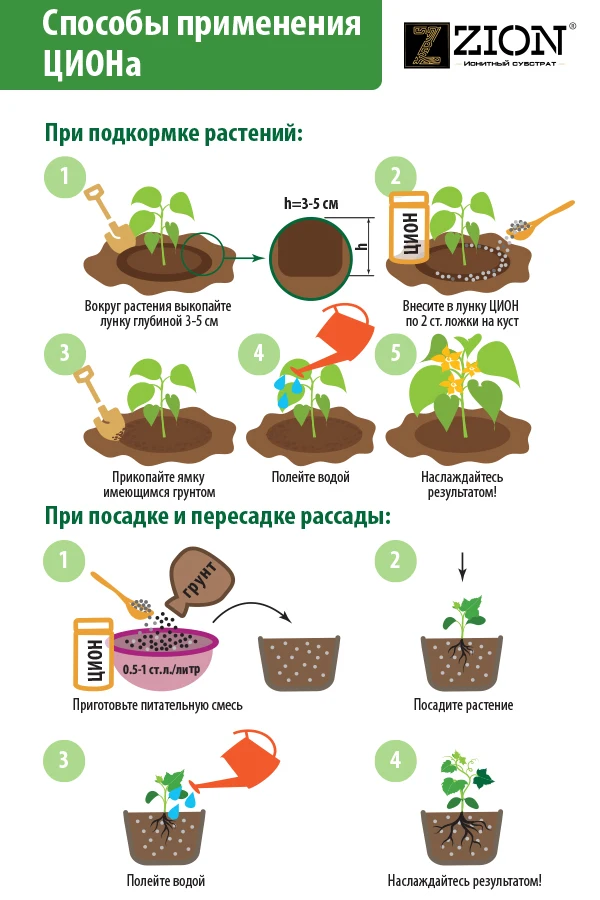 Для подкормки растений в открытом грунте или в теплице: внесите по 1-2 столовые ложки ЦИОН по кругу посадочной ямы куста, прикапывая на глубину 5-7 см. Присыпьте землей и полейте водой. Подкормку растущей рассады можно производить с мая по сентябрь.