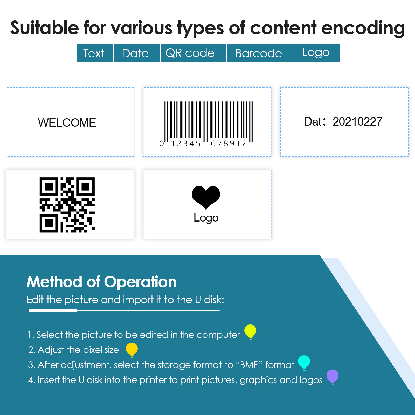 1. Портативный портативный принтер (PT2000) подходит для печати текста, этикеток, цифровой печати, qr-кода, штрих-кода, даты производства, времени, логотипов и т. д. Используя высокое разрешение, Быстросохнущий Черный чернильный картридж, печать чрезвычайно чистая. Этот ручной принтер может печатать на различных материалах и отвечает различным требованиям для печати.